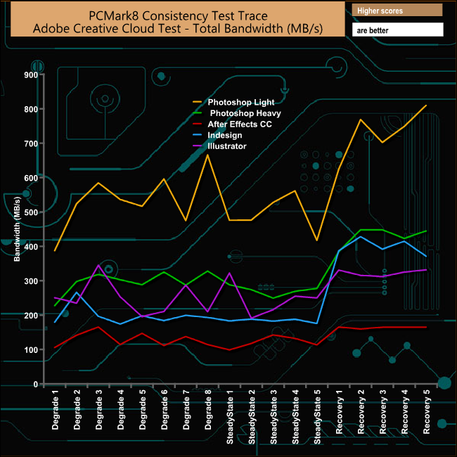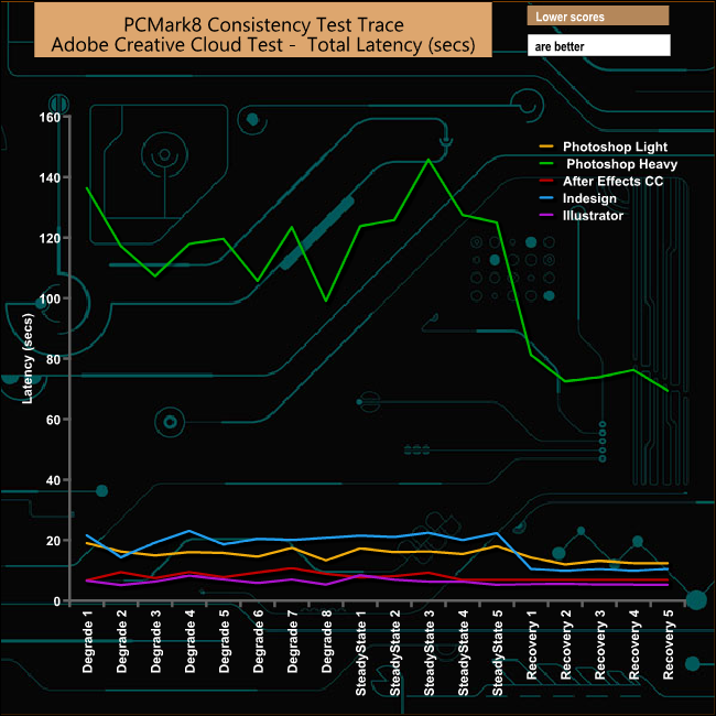 PCMark 8’s Consistency test provides a huge amount of performance data, so here we’ve looked a little closer at how the WD Black PCIe 512GB performs in each of the benchmarks test suites.
