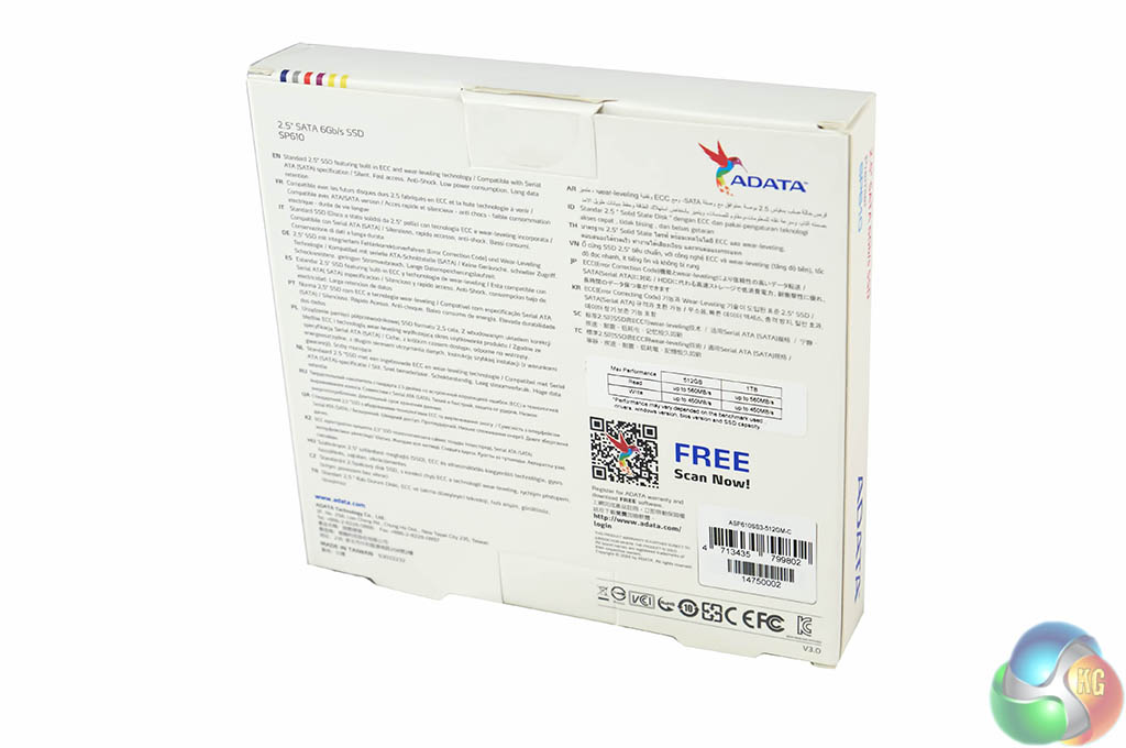 The colourful ADATA bird takes pride of place on the edge of the sticker, with the company name and drive capacity visible. Details of the unit, warranty code etc is shown on the rear of the chassis.