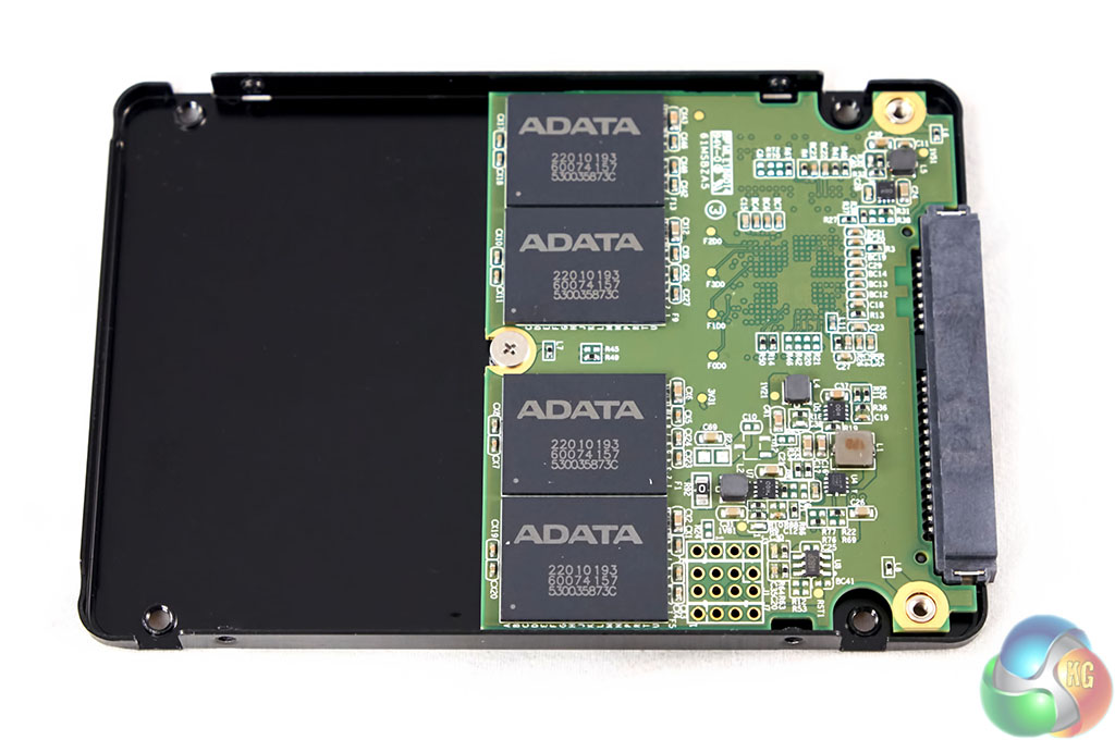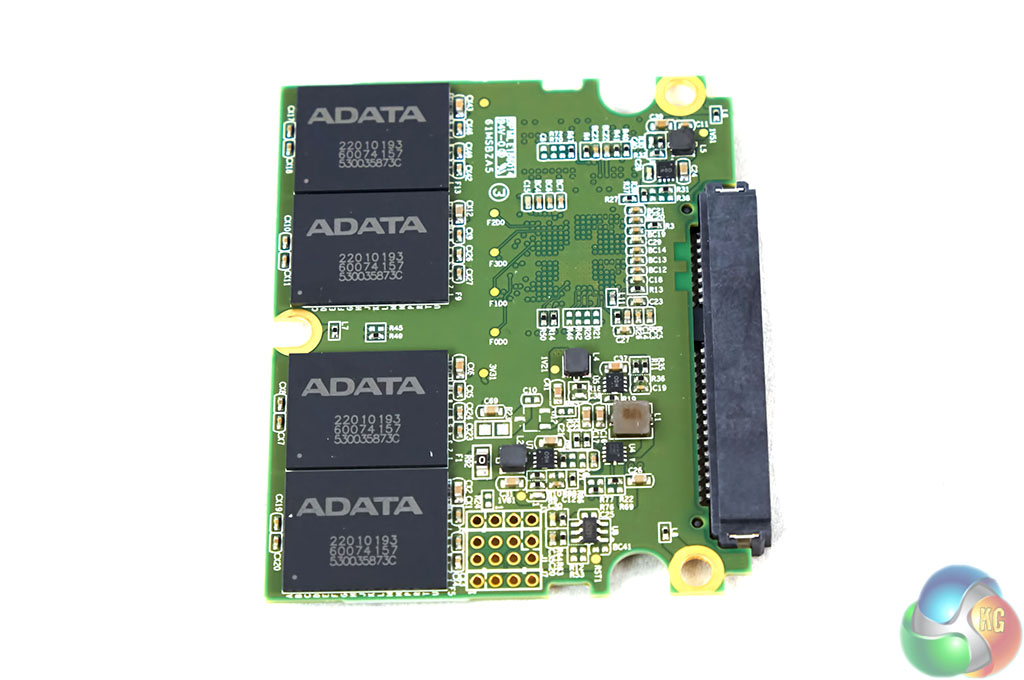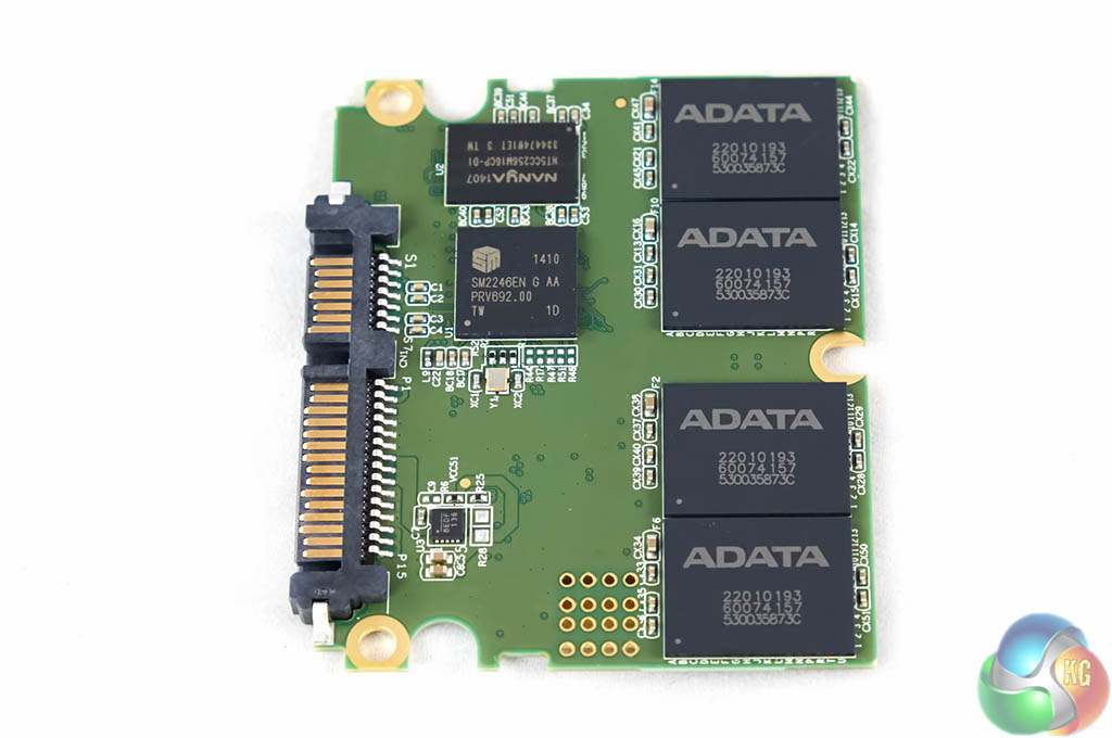 This is a ‘half length' PCB screwed into the standard 2.5 inch drive chassis, as shown above. The Silicon Motion (SMI) SM2246EN four channel SATA 3 controller is visible, alongside a single module of NANYA 256MB DDR3 DRAM cache memory. 512GB of Micron 20nm Synchronous MLC NAND memory is installed on the PCB – with four modules on each side.