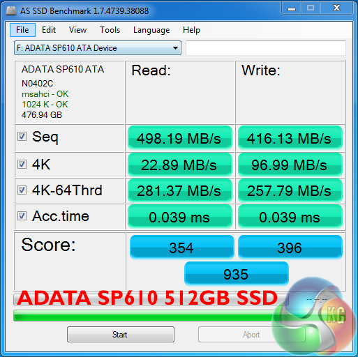 AS SSD deals exclusively with incompressible data and the Silicon Motion (SMI) SM2246EN four channel controller shows reasonable strength -with a final score of 935 points.
