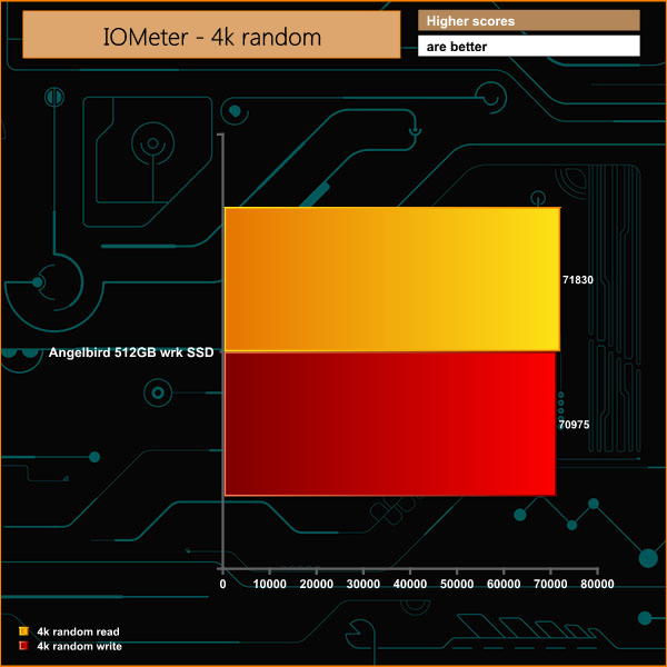 IOPS performance is very good, with both 4k random read and write scoring between 70,000 and 72,000. Our results are slightly higher than Angelbird claim in their official literature.