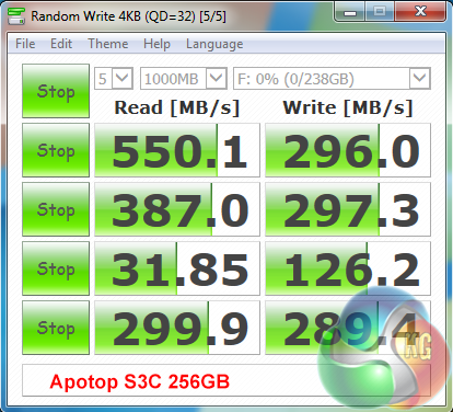 Apotop seem to have conservatively rated the drive – claiming it would score ‘up to' 490 MB/s read and 275 MB/s write. Our own tests show close to 550MB/s read and 300 MB/s write. 4K performance looks to be strong – hitting between 290 MB/s and 300 MB/s in write and read tests respectively.