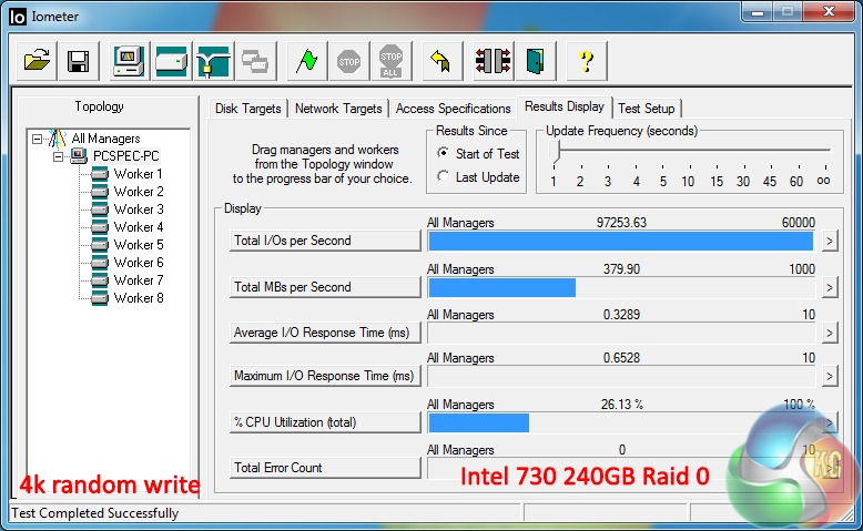 In Raid 0 the IOPS performance increases substantially, increasing to 102,041 IOPS in the 4k random read test and 97,253 in the 4k random write test. Intel’s official IOPS performance for a single drive is rated at 86,000 read and 56,000 write, so our results are actually better than Intel’s official claims.