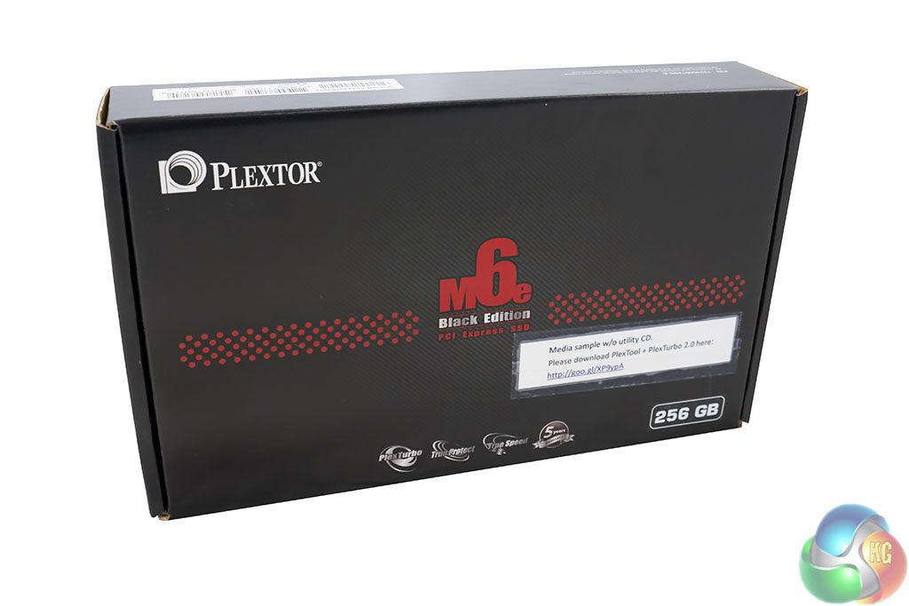 The Plextor M6e Black Edition PCIe 256GB ships in a rather large black box with some details on the front. The Plextor PR team have been keen to push the fact that drive can be upgraded easily enough and that the newest versions of the software, along with PlexTurbo 2.0 can be downloaded. More on this later.