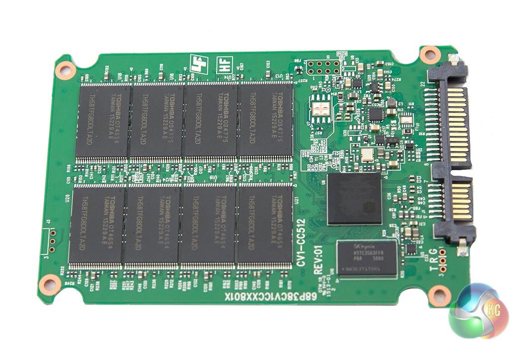 The drive incorporates A15nm Toggle NAND from Toshiba. There are 8 NAND flash memory chips on one side of the PCB. The other side is left empty – although the 512GB version of this drive would likely be fully populated on both sides. The controller chip is the Silicon Motion SMI-2246. There is a DDR3 Hynix memory cache chip installed on the PCB – in this case 256MB.