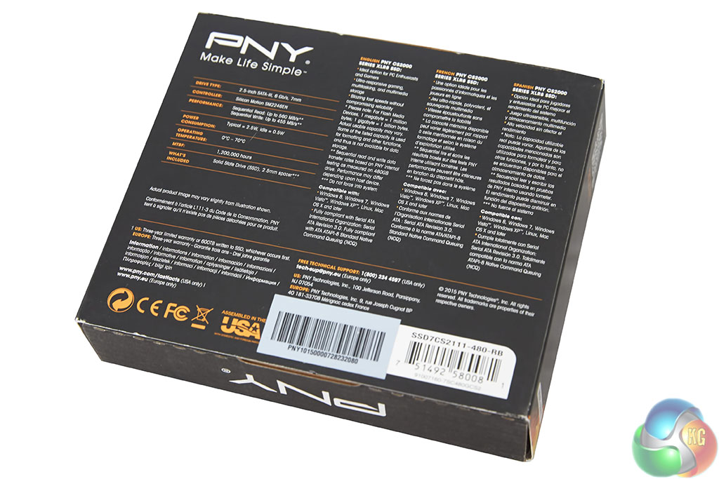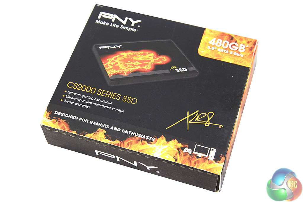 The PNY CS2111 XLR8 480GB arrives in a small, flat box with an image of the product, along with details on the front.