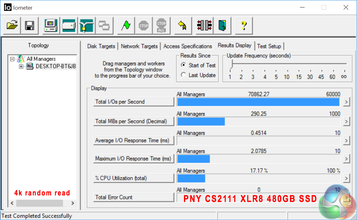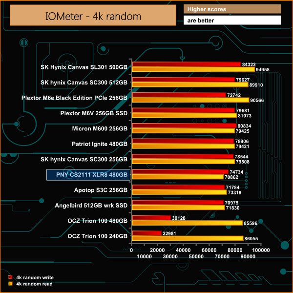 IOPS performance is not lacking in both 4k random read and 4k random write tests – scoring in and around the 70,000-75,000 mark. These figures are very close to the official PNY rated specifications (Up to 71k read, and 75k write), so it is good to see PNY aren't inflating figures.