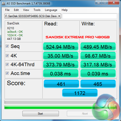AS SSD deals exclusively with incompressible data and some drives score badly. No such concerns for the Sandisk Extreme Pro 480GB – the overall score of 1172 is one of the highest we have ever recorded from a single drive.