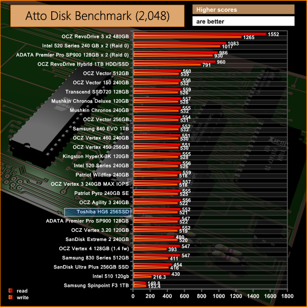 Sequential read and write performance is very strong, peaking at 552 MB/s read and 521 MB/s write in ATTO.