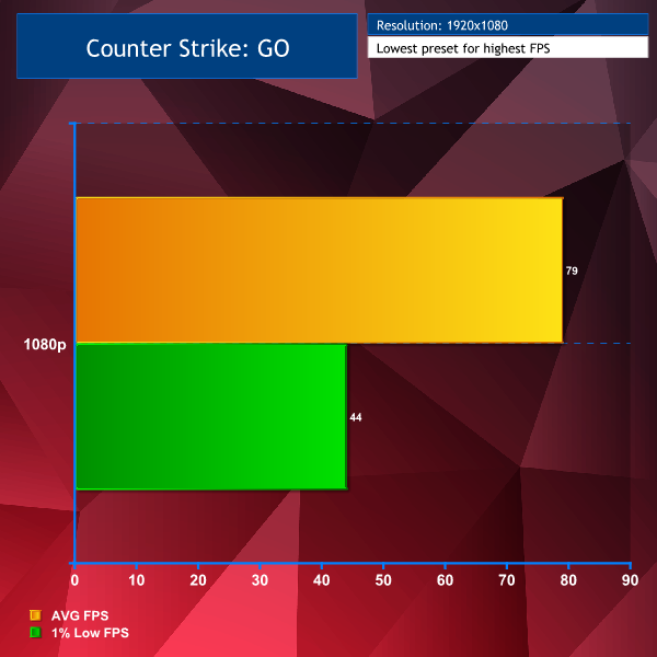 Counter Strike GO on the lowest preset, at 1080p did fairly well at nearly 80FPS average and 1% low of 44 FPS.