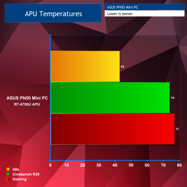 Moving onto our final results now, our R7-4700U temperatures saw an idle of 43 degrees, hitting 74C during Cinebench R20 runs and 77C during Rocket League. Not bad at all considering how compact this system really is.