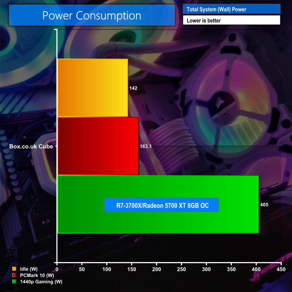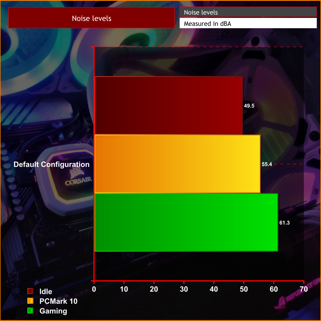 Noise levels of the system shows us it’s fairly loud but do remember there’s 8 fans inside this excluding the graphics cards fans! Finally, the system power draw comes in around 400W when gaming, putting the 750W at just over 50% load ensuring strong efficiency levels.