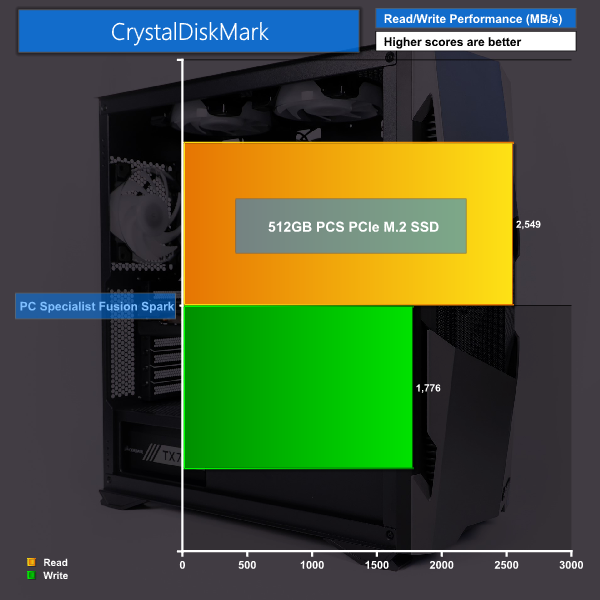 The 512GB PCSpecialist NVMe M.2 drive outperformed its rated speeds of 2000 MB/s read and 1100 MB/s write, by achieving 2550 MB/s and 1775 MB/s read and write, respectively, in our CrystalDiskMark testing. This isn’t the fastest NVMe drive out there but at the same time this system as a whole only cost £999 so the drive was one of the compromises that PCSpecialist have clearly made.