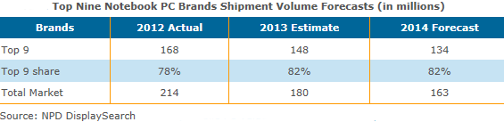 According to the NPD DisplaySearch, the 2014 shipment estimate for the top nine notebook manufacturers is 134 million, which is a decline from the earlier estimation of 152 million devices. It is likely that notebook PC shipments will decline again in 2014, as they did in 2013. The top nine laptop makers are Apple, Asustek Computer, Hewlett-Packard, Lenovo, Samsung, Sony, and Toshiba. NPD DisplaySearch makes assumptions regarding the volumes based on the checks with display panel suppliers.