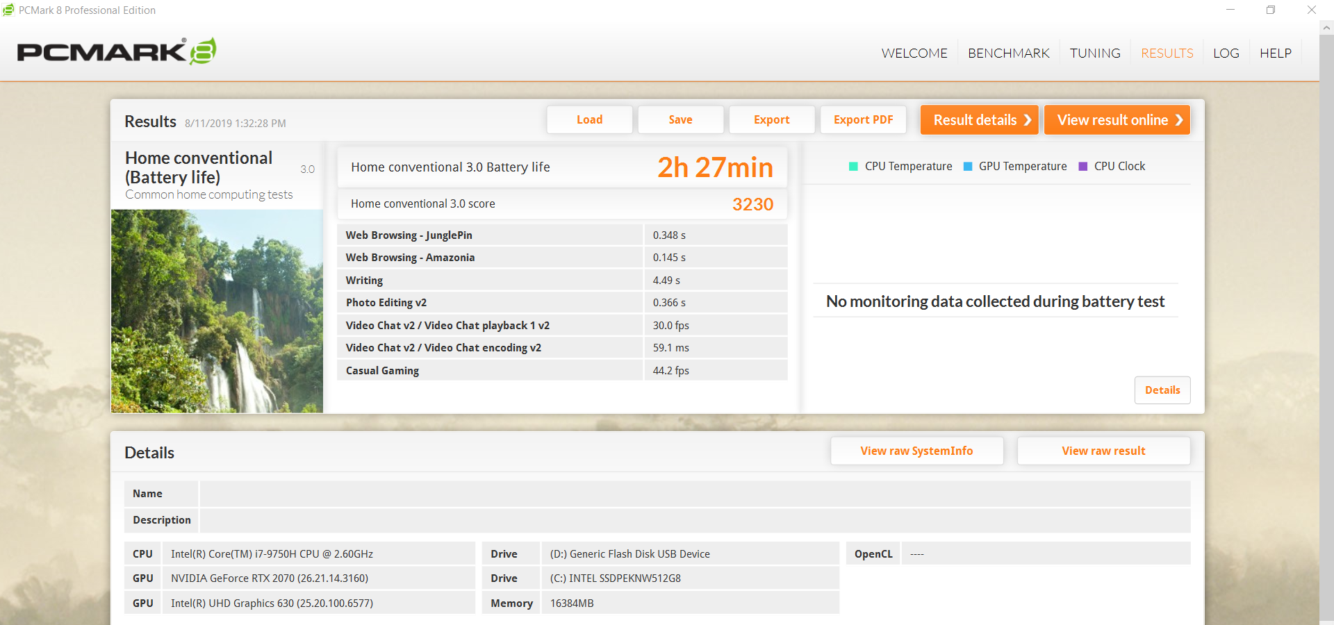 To test battery life I used the ‘Home’ benchmark in PCMark 8. This test isn’t hugely demanding when it comes to computational requirements and, although artificial, it is likely to simulate the sort of stress the laptop would undergo while doing a small amount of video editing, web browsing and word processing. I set the screen brightness to 100%, and the keyboard brightness to 100%.