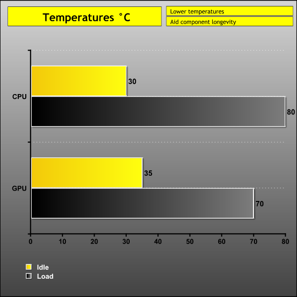 Idle temperatures are about 10C to 15C above ambient, with our figures showing 30C for the CPU and 35C for the GPU. This is pretty much as expected and is exactly the same idle temperature I see regularly with my case reviews.