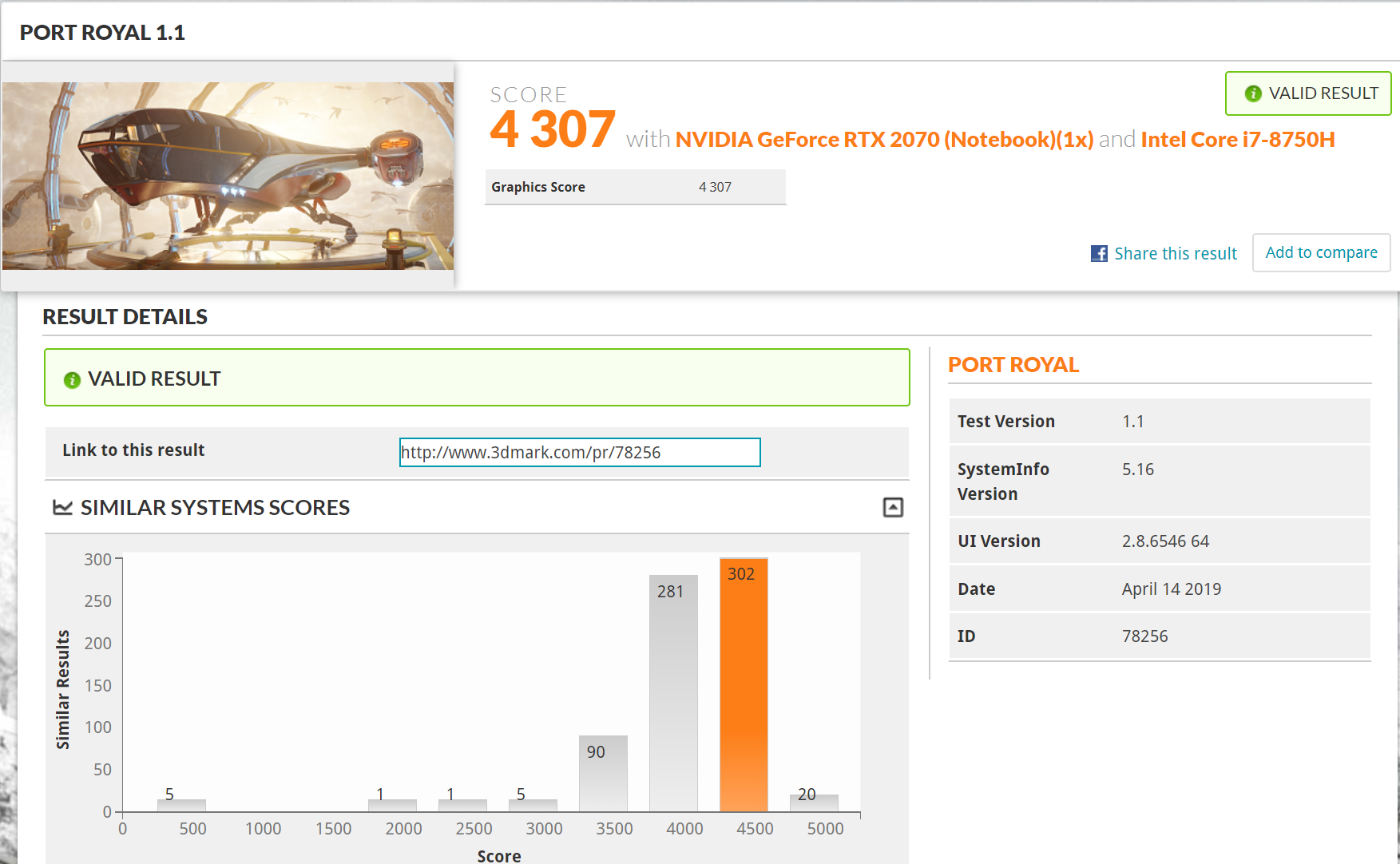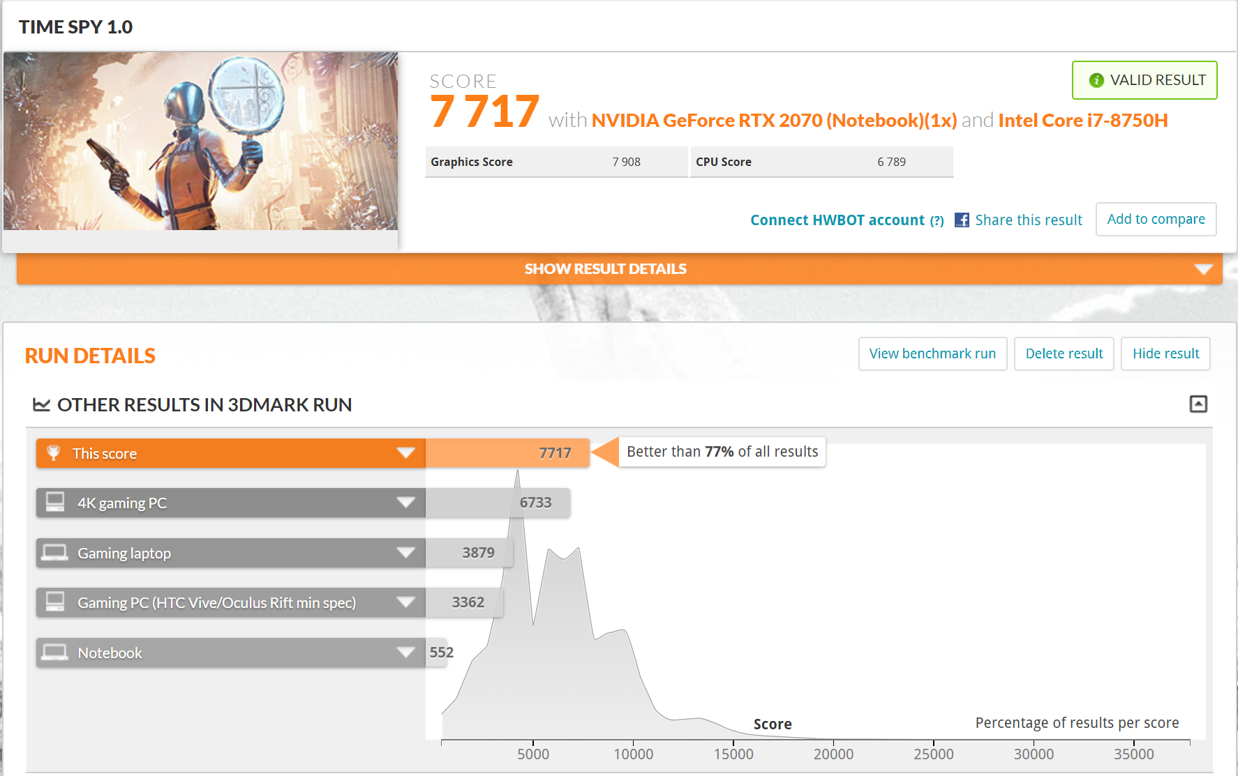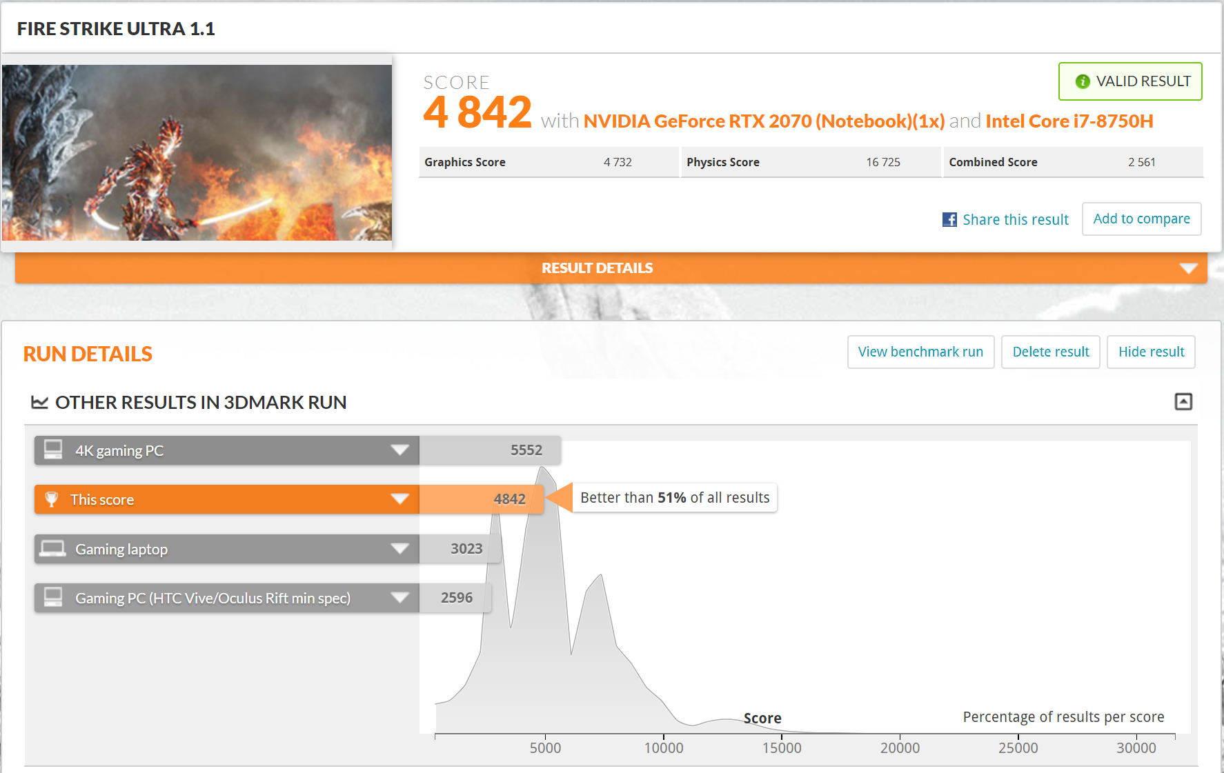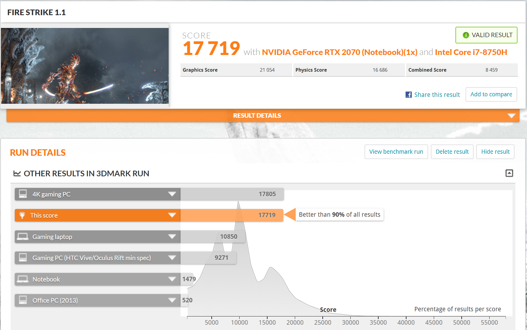 The 3DMark scores from this laptop are very impressive and show it to be a highly capable machine. The RTX 2070 boosts to a high clock speed of 1680MHz and beats out the similarly specced ASUS ROG Strix Scar II in all of the benchmarks. The Physics and CPU scores are equally impressive, as we have come to expect from the I7 8750H.