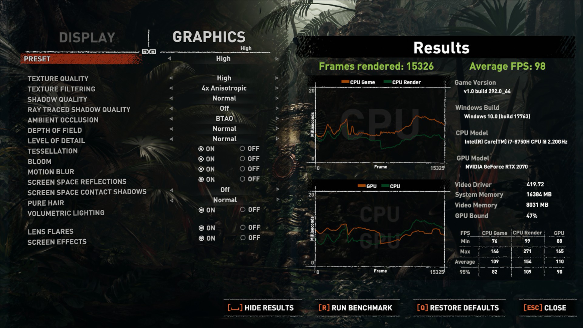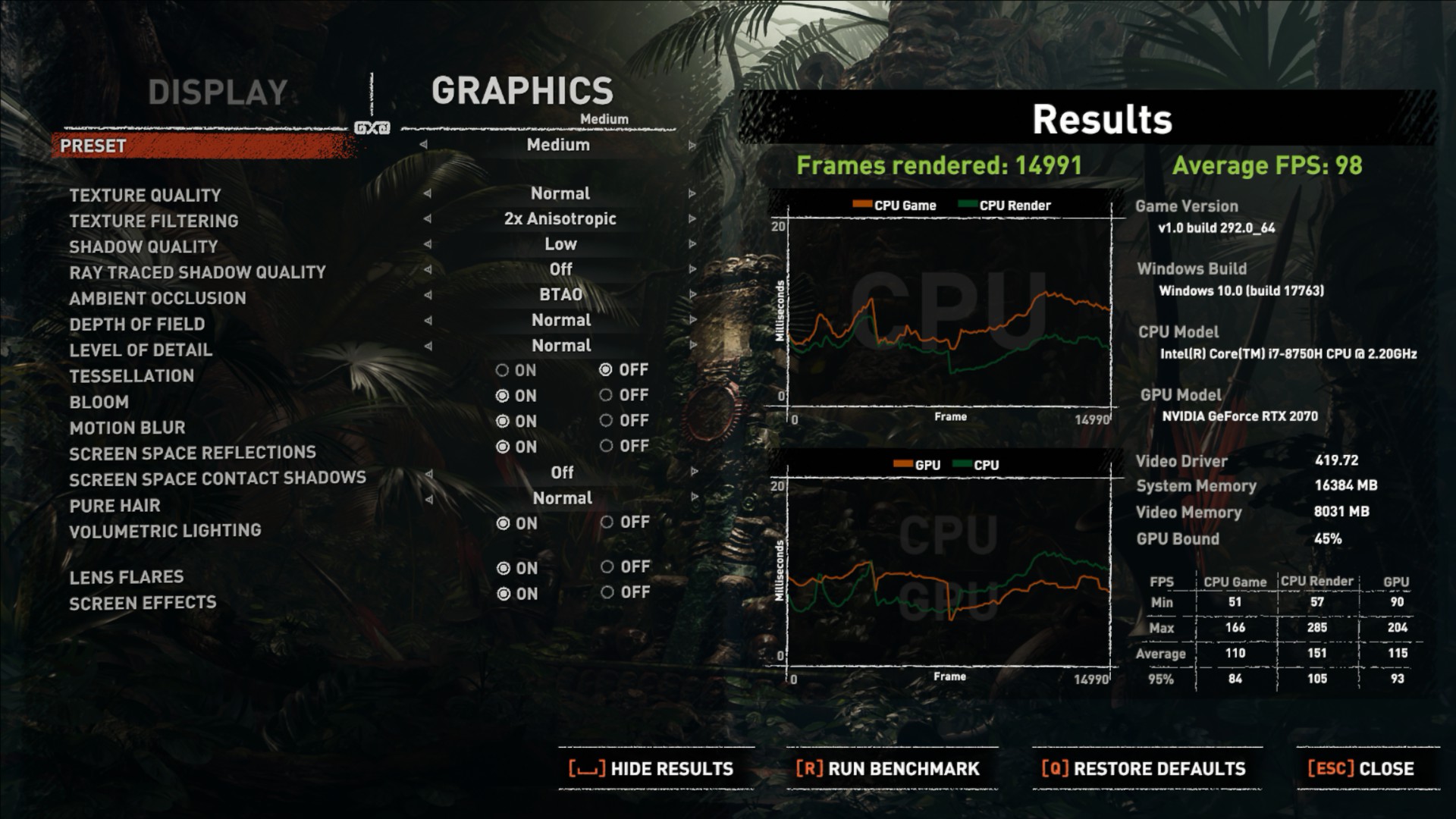 Rise of the Tomb Raider is an action adventure game with many different environments and immersive landscapes making it a useful way to test this laptop’s gaming performance. We tested on Very high settings with AA disabled.