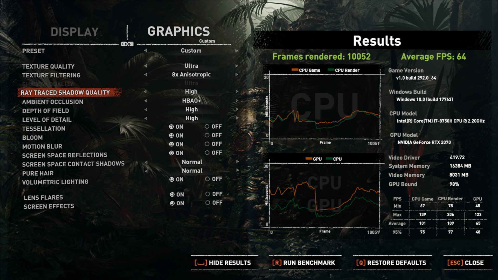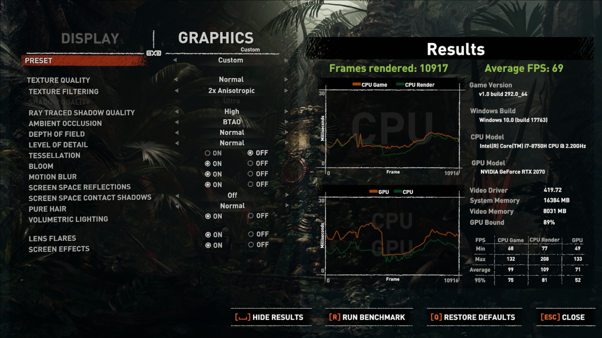 Shadow of the Tomb Raider: Is the most recent release on our line up of tester games and supports Nvidia's RTX technology. We tested the game at several different preset graphical settings with DLSS & DX12 turned on. We then also tested the same graphical settings again with RTX turned on and ray traced shadow quality set to high.