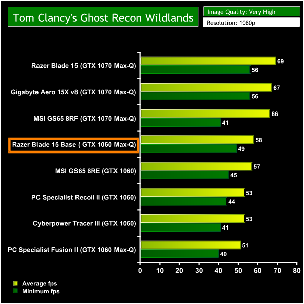 Tom Clancy’s Ghost Recon Wildlands is a game with a superb open world environment. The beautiful scenery of mountains, forests and deserts requires a lot of GPU power to render, particularly on high settings. This demanding game is perfect for testing this PC’s gaming performance.