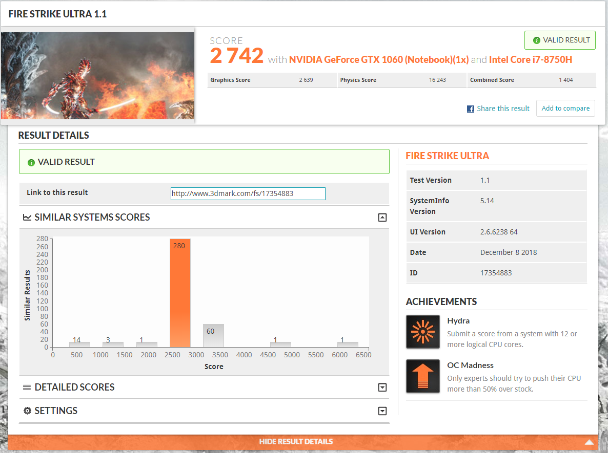 The 3D Mark scores coming from this laptop are very impressive. It managed to overtake laptops featuring the full fat GTX 1060 even though the Blade 15 only features the Max Q model. The maximum boost clock of 1746MHz and good cooling mean the GPU can perform to its full potential and produce some great results.
