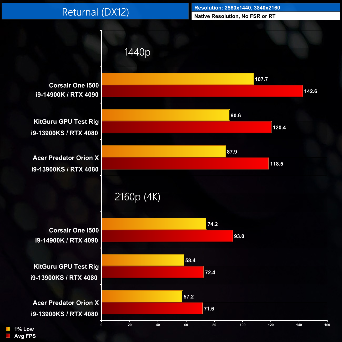 As you can see from the benchmarks, the Orion X is much more competitive with our own test system when it comes to gaming, as the restrictive PL1 limit is not really a factor here. There are a couple of occasions where we see a small difference between the two machines, but nothing more than a handful of frames, so you'd be hard-pressed to notice in the real world. That means it is a very capable machine for both 1440p and even 4K gaming, and you can always enable DLSS for a further frame rate boost in the games that support it.