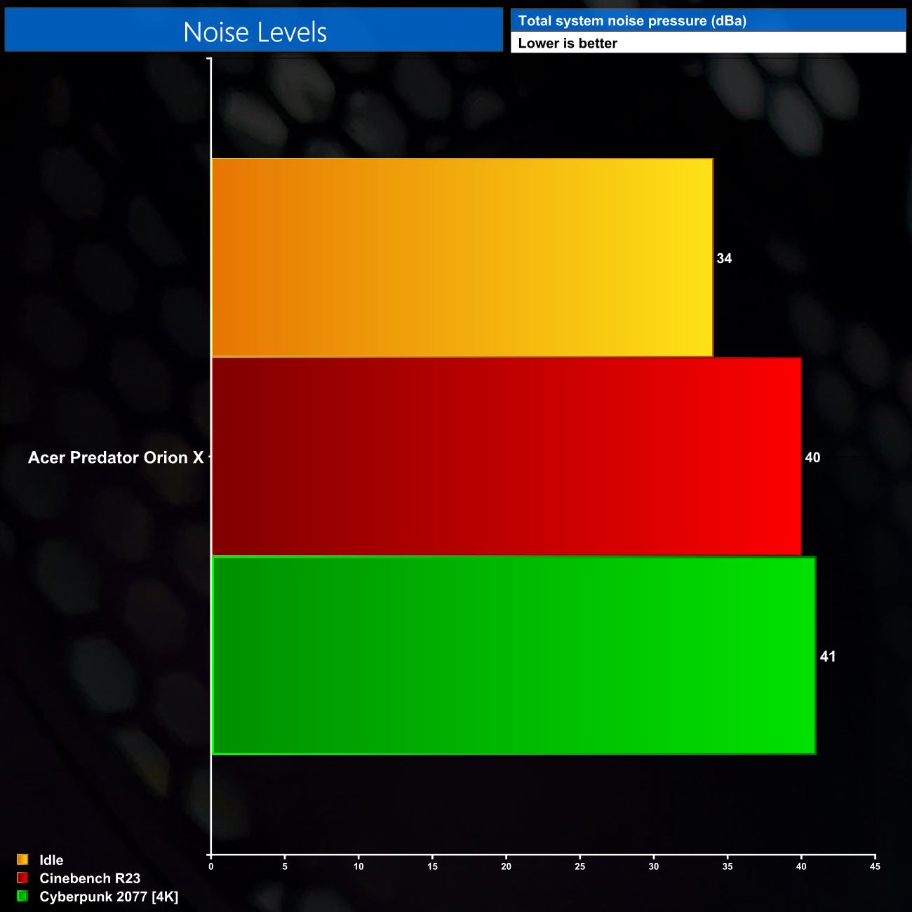 The Orion X isn't a particularly loud system, either. It is audible under load, hitting 41dBa when gaming, but that would be easily drowned out by a headset or even quiet speakers.