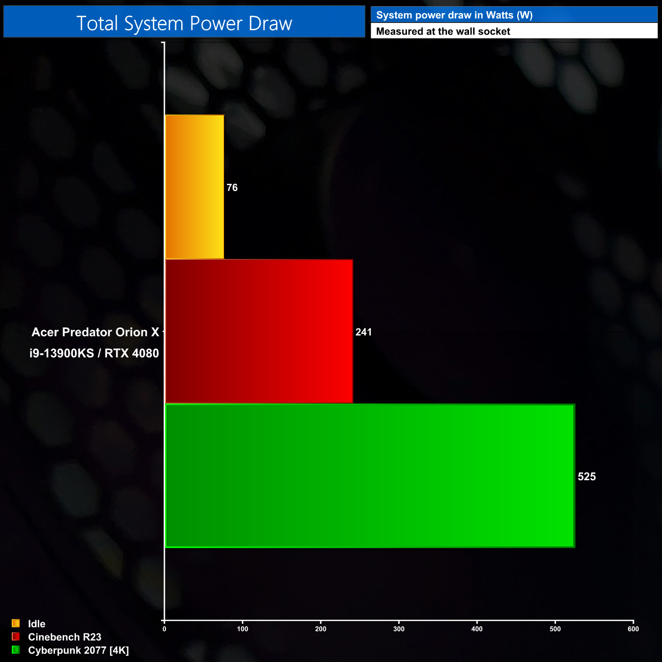 Lastly, total system power is nothing to worry about either. When gaming we saw over 520W in Cyberpunk, but that's well below the 850W capacity of the power supply. You'd even be able to stick a 4090 in without any issues, so there is scope to swap out the GPU down the line if you purchase the Orion X.
