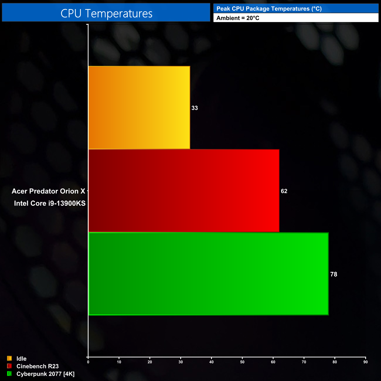 Moving onto CPU thermals, the i9-13900KS actually ends up running very cool by its standards, all down to the 150W PL1. In Cinebench for instance, it ran at just 62C, while it hit 78C in Cyberpunk 2077. For me, there is definitely a lot more thermal headroom to push the power draw, and thus clock speeds, of this CPU, but we suspect the basic motherboard VRMs are the reason behind the 150W PL1, rather than raw CPU thermals.