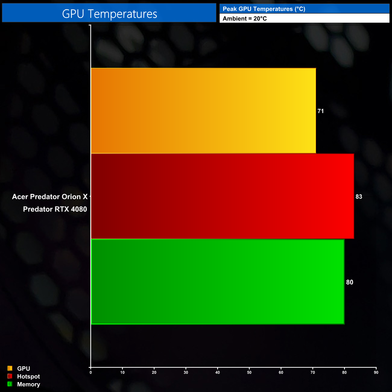 GPU thermals are also nothing to worry about, the triple-fan unit delivers solid results with the hotspot hitting 83C and the memory at 80C.