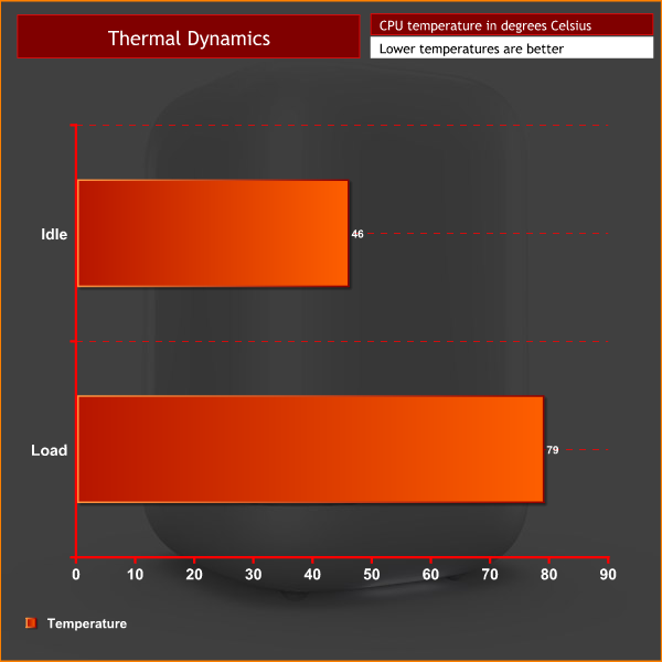 As you can see, temperatures inside the Revo One are absolutely fine – a peak of 79 Celsius during Prime95's Small FFTs test is warm but well within the thermal limits of the CPU. Power draw is also just what we would expect from a system based on the Broadwell-U architecture.