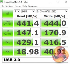 As expected, we see speeds in excess of 400 MB/s which indicates that the USB 3.0 interface is just fine.