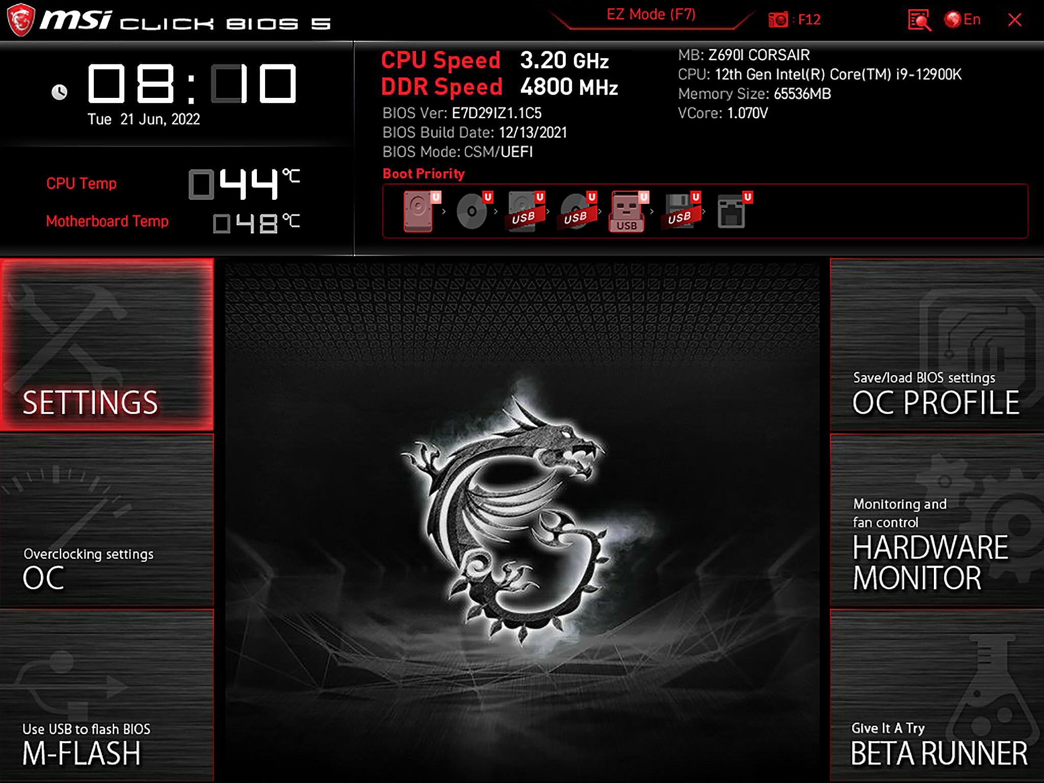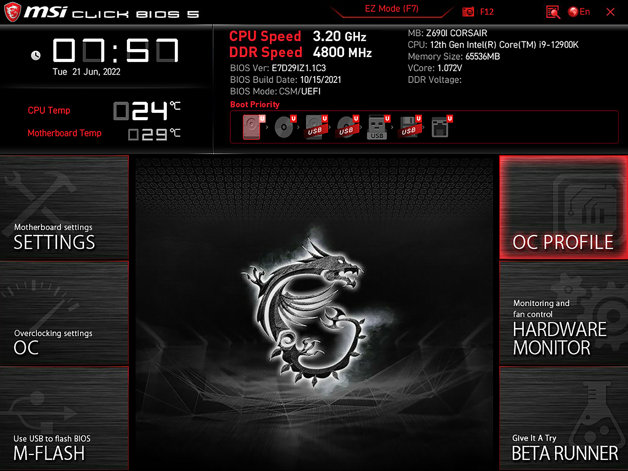 Updating to the latest BIOS – EZD29IZ1.1C5 – resulted in the Long Duration power limit now showing 165W, in accordance with Corsair's reviewer's guide. This BIOS version is the latest one available and can be downloaded through Corsair's website, though it is still only dated to December 2021, so it is not especially recent.