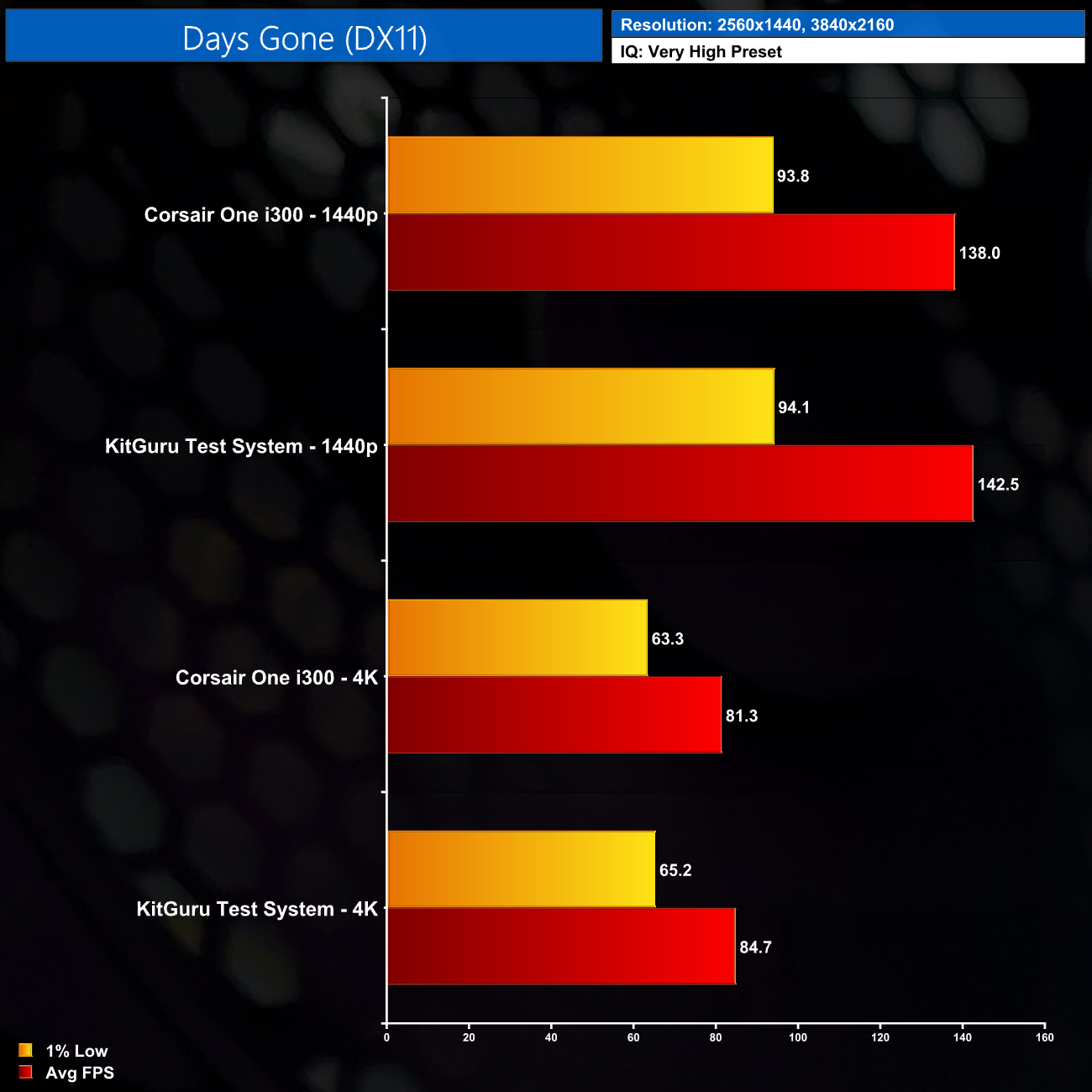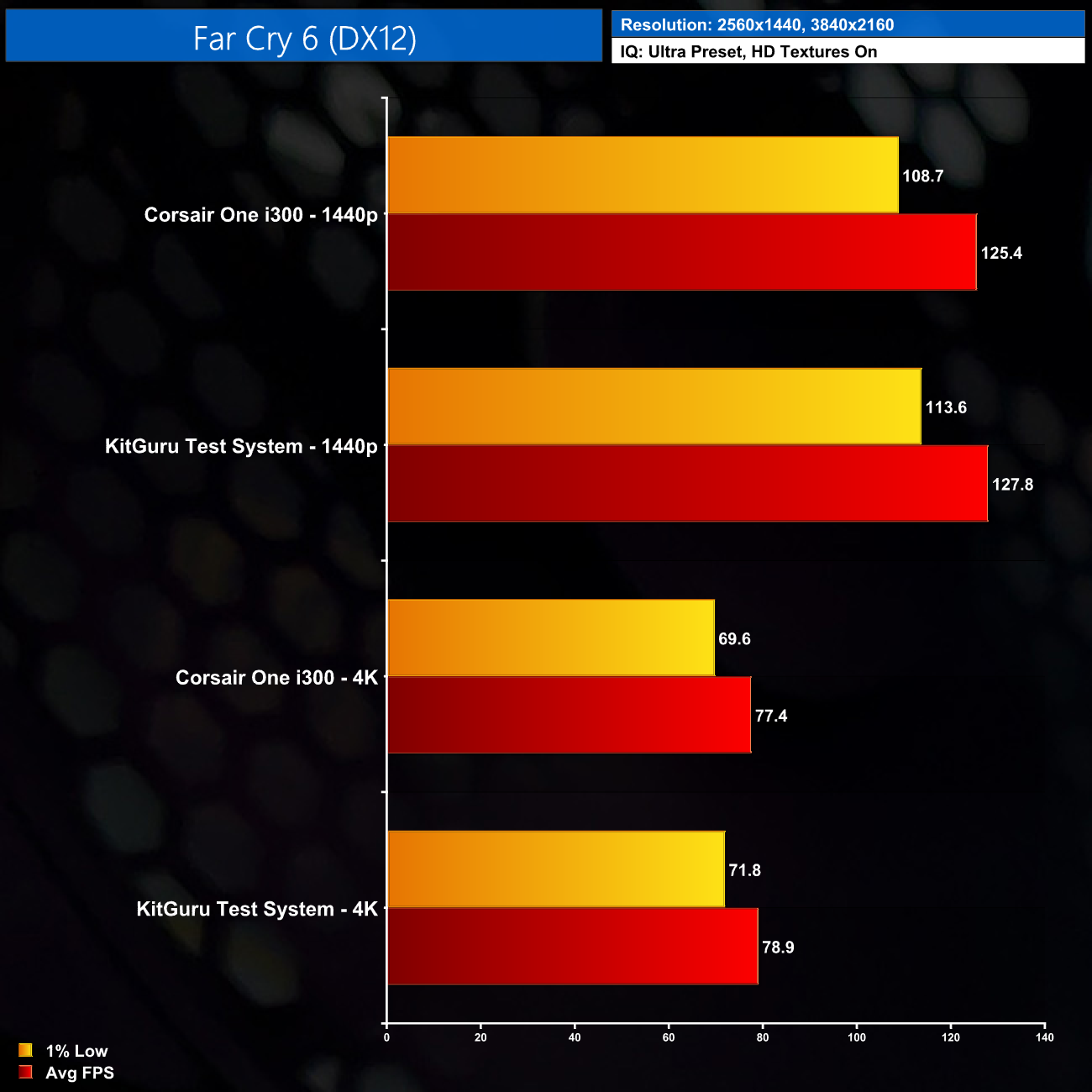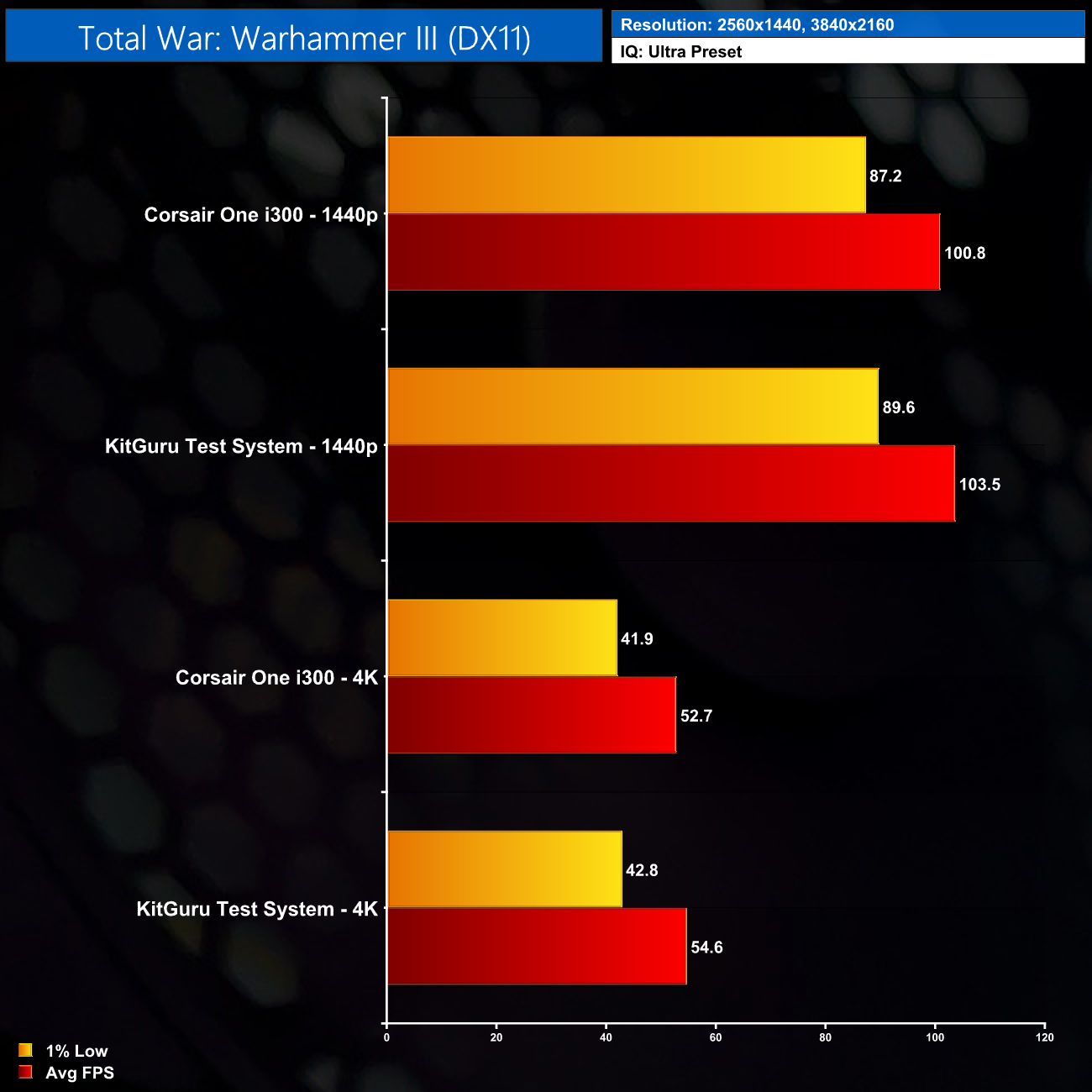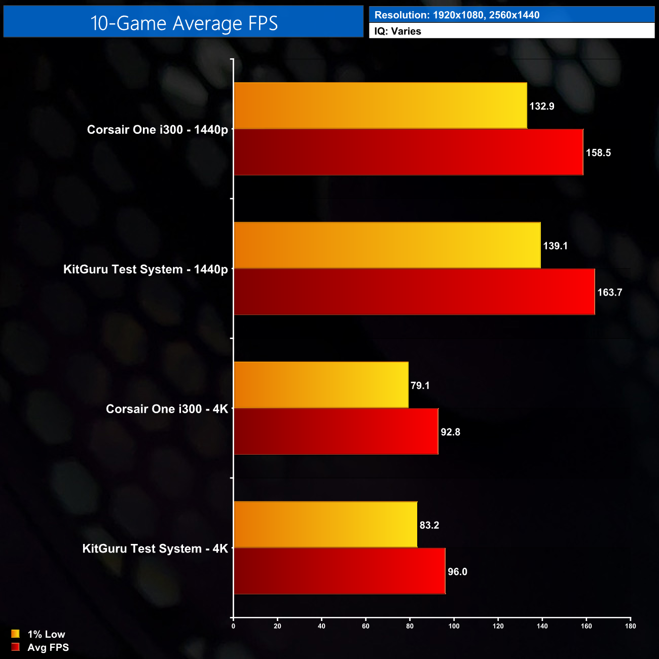 Overall, gaming performance is excellent from the Corsair One. It is on average just 3% behind our GPU test system – a proper mid-tower gaming PC – and delivered great frame rates across the board. The RTX 3080 Ti is one of the fastest graphics cards on the market right now and would pair very nicely with either a high refresh-rate 1440p, or even 4K, gaming monitor, as we can see from the average results shown above. In fact, of the ten games tested, only two – being Cyberpunk 2077 and Total War: Warhammer III – were unable to average above 60FPS at 4K, so that tells you pretty much everything you need to know about the gaming performance.