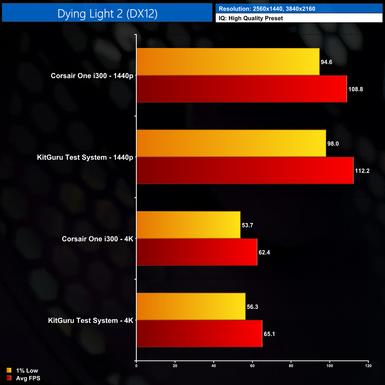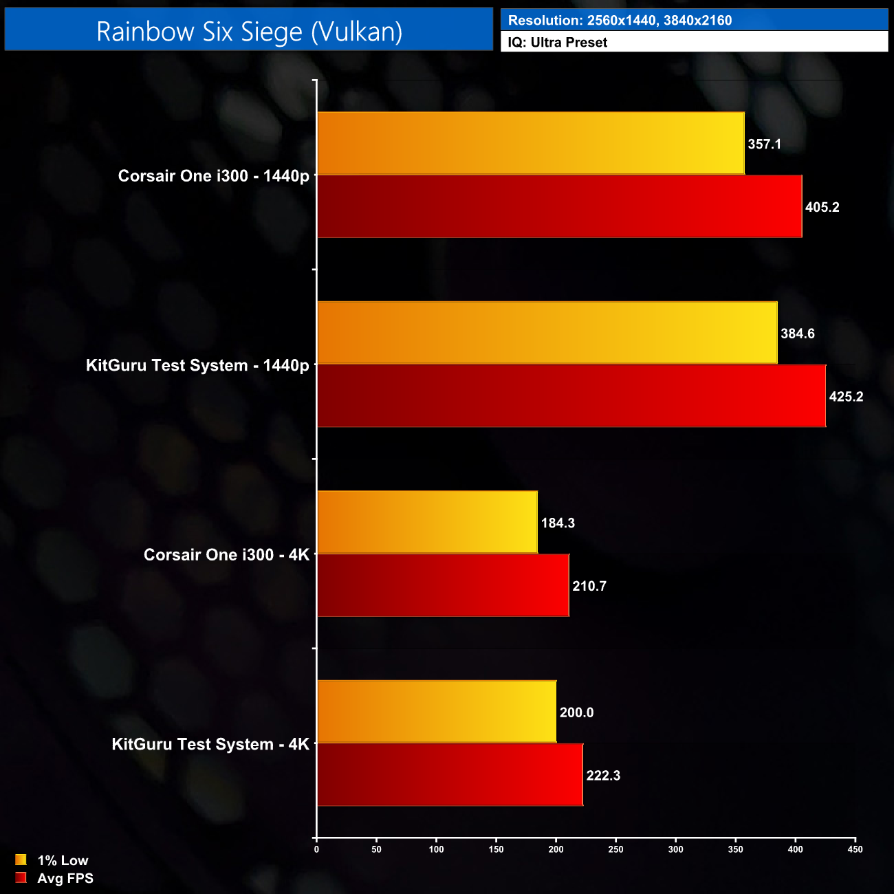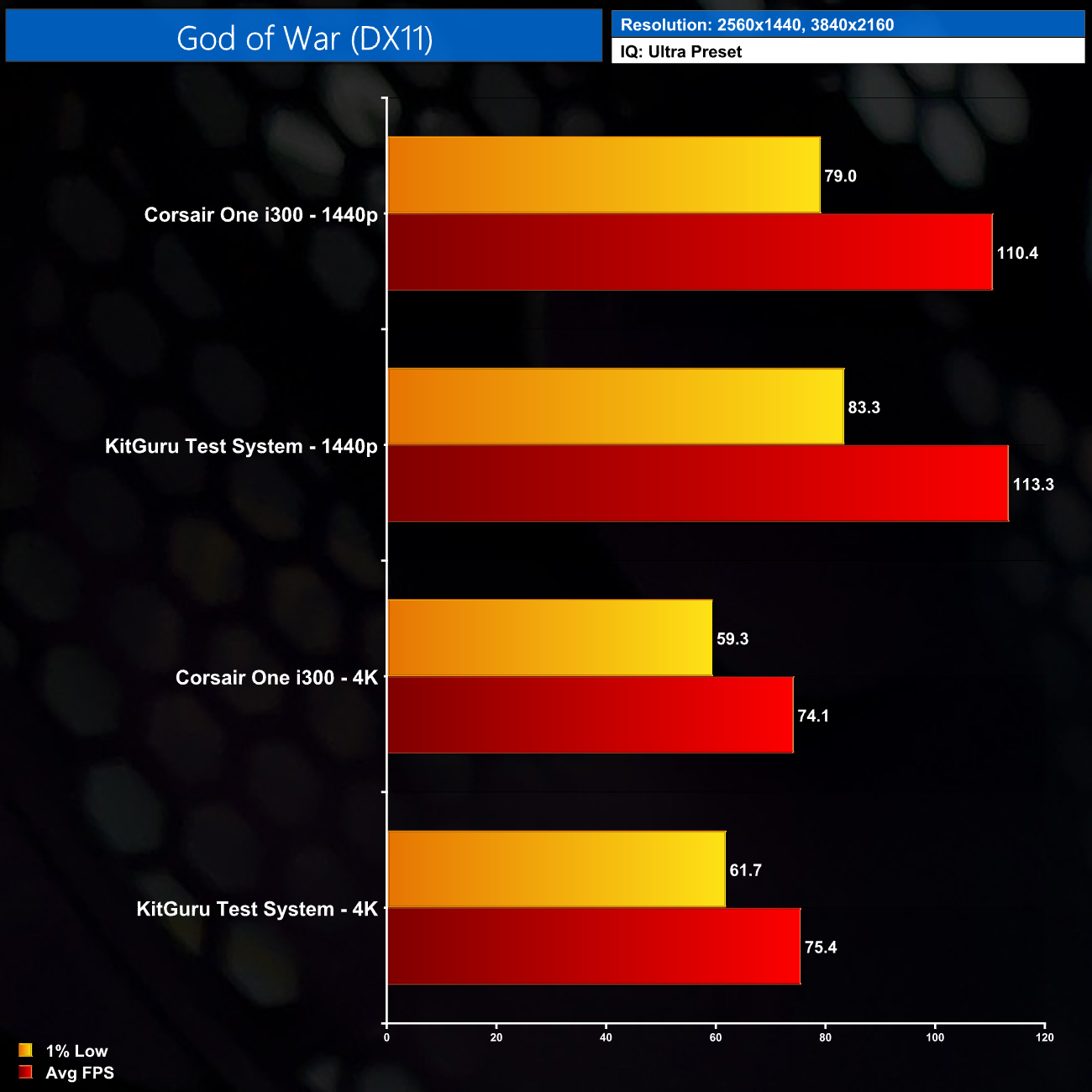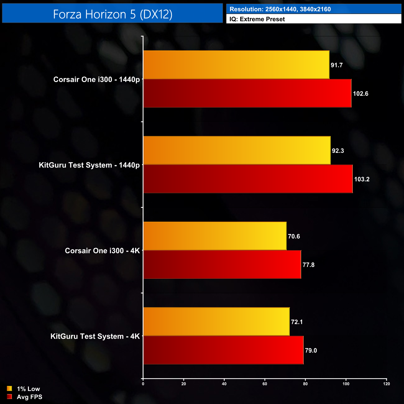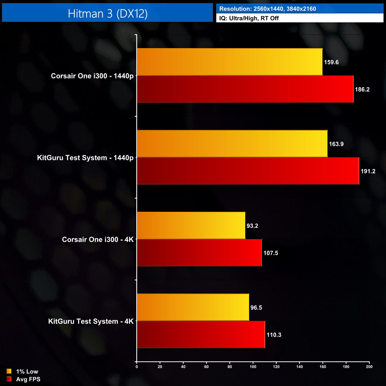 Overall, gaming performance is excellent from the Corsair One. It is on average just 3% behind our GPU test system – a proper mid-tower gaming PC – and delivered great frame rates across the board. The RTX 3080 Ti is one of the fastest graphics cards on the market right now and would pair very nicely with either a high refresh-rate 1440p, or even 4K, gaming monitor, as we can see from the average results shown above. In fact, of the ten games tested, only two – being Cyberpunk 2077 and Total War: Warhammer III – were unable to average above 60FPS at 4K, so that tells you pretty much everything you need to know about the gaming performance.