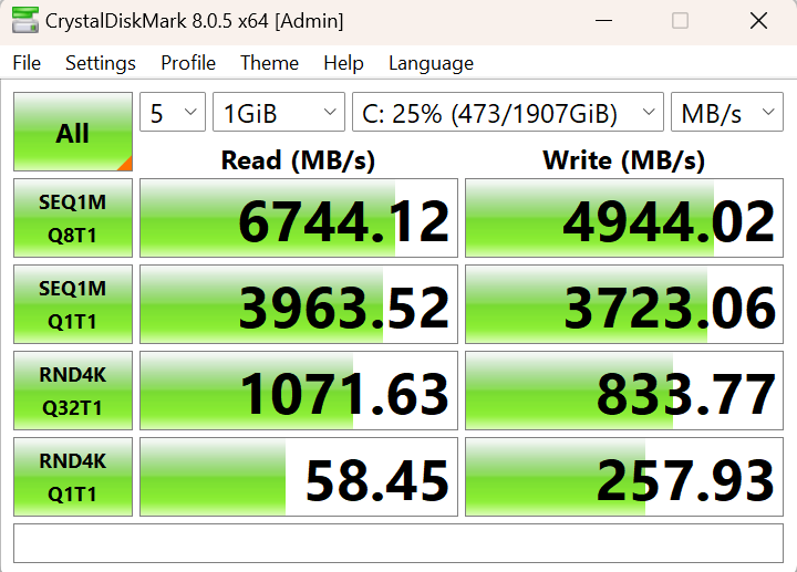 Lastly, as for the 2TB Samsung PM9A1, this delivers pretty much what we'd expected in terms of read and write speeds, hitting 6700MB/s reads and 4900MB/s writes. As a reminder, the B760 motherboard used here doesn't support Gen5 M.2 drives, so you couldn't get much faster storage than this in the Corsair One.