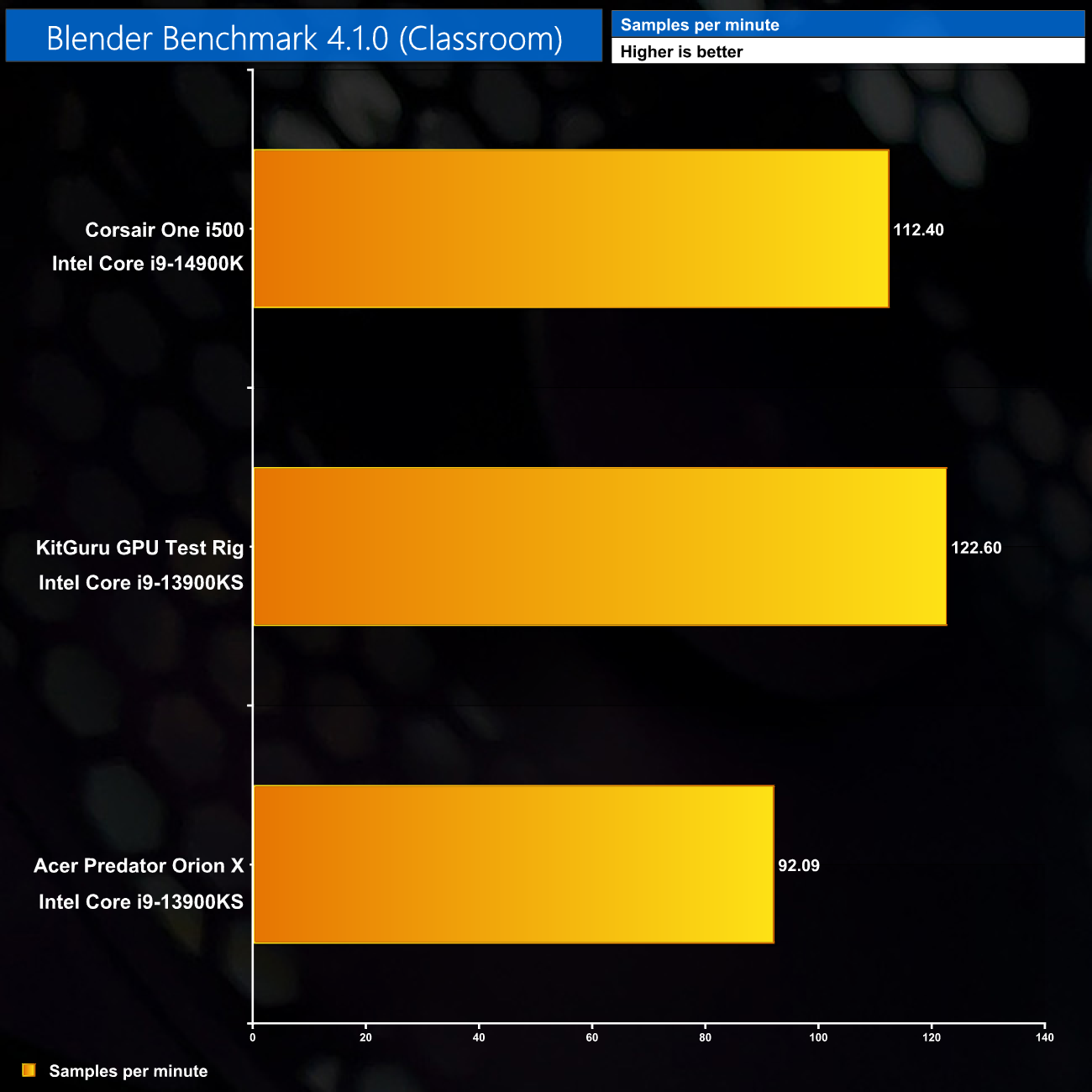 Blender is another multi-core workout however, and this does show the 14900K in the One to fall behind the 13900KS in our own test rig, this time by a 9% margin.