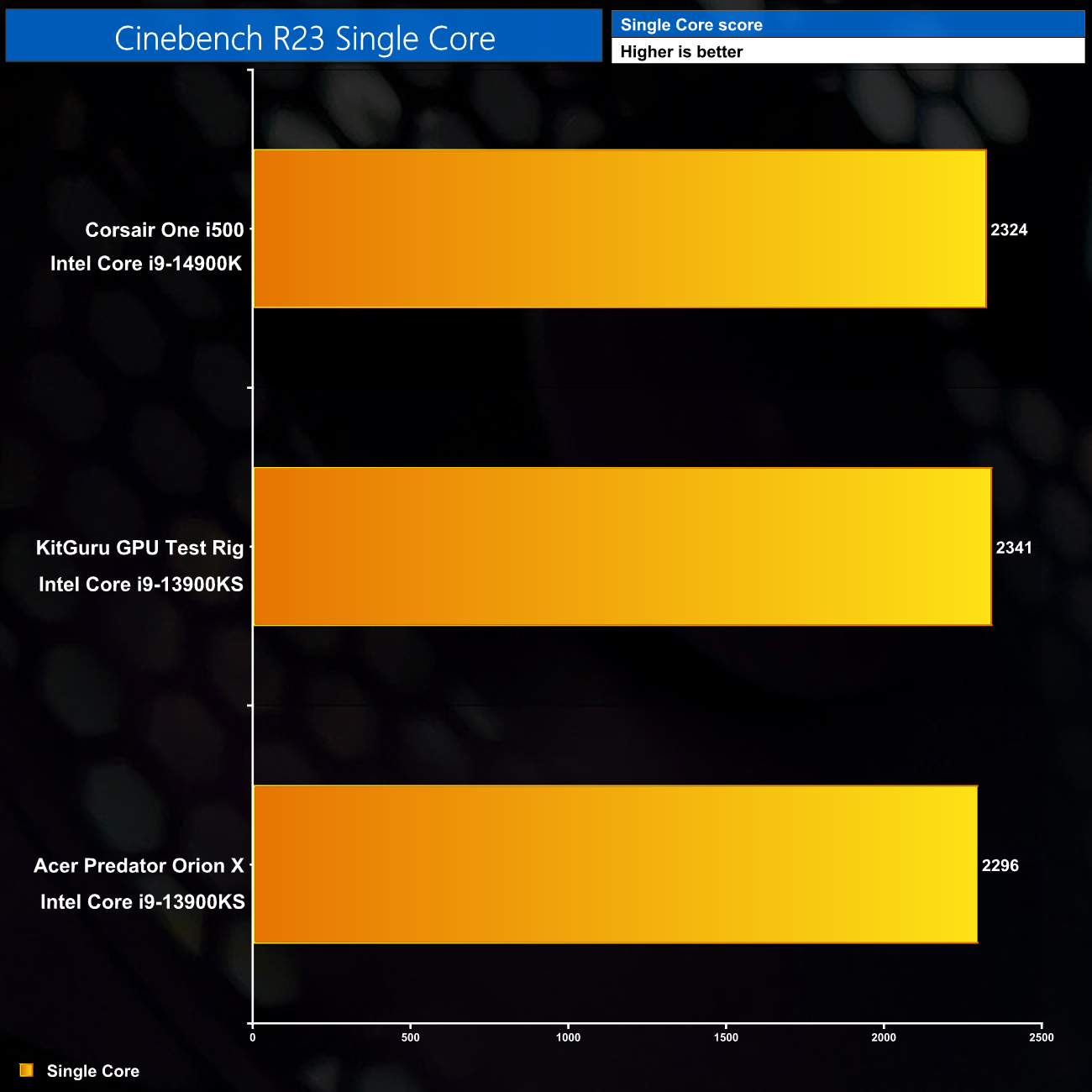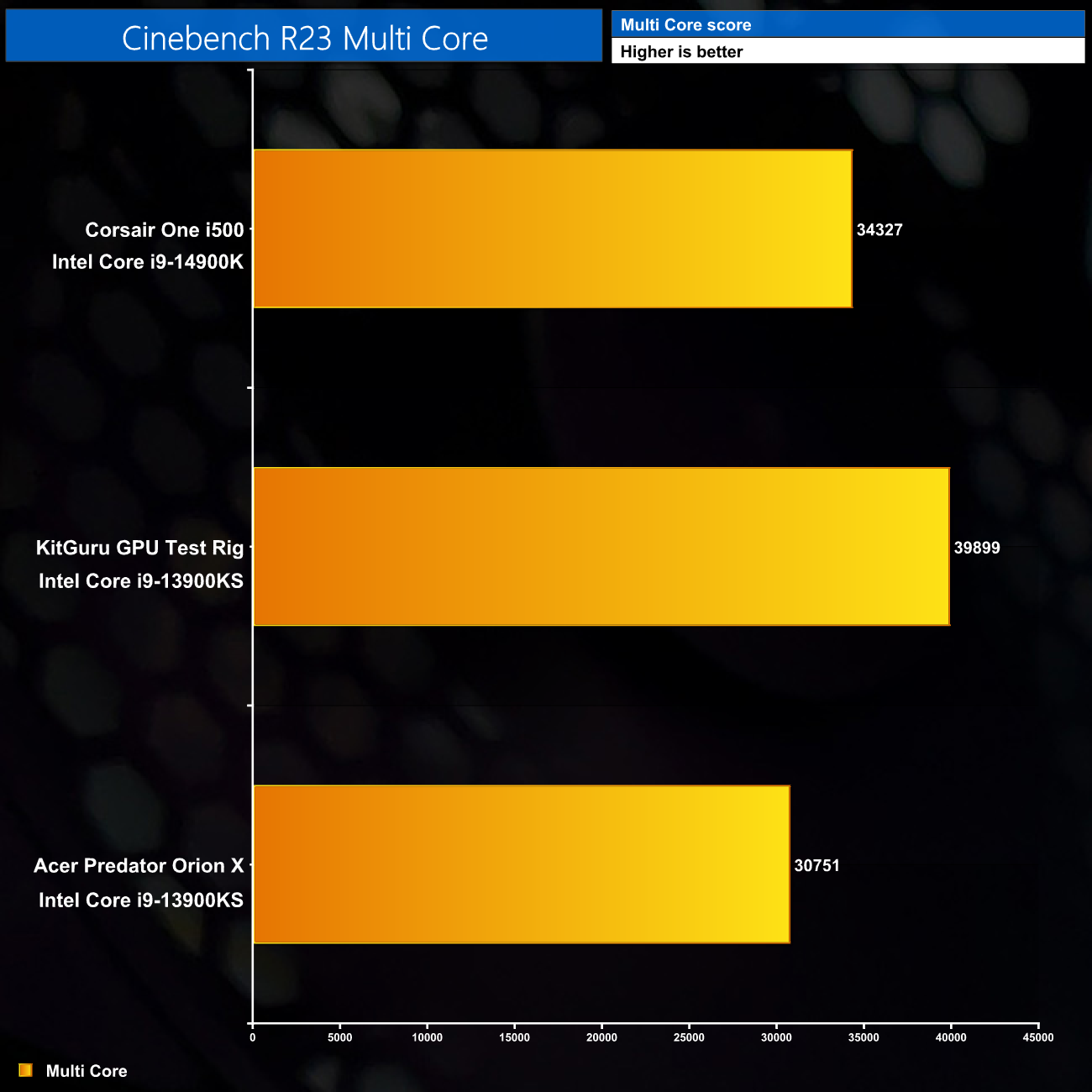 Cinebench Multi Core shows performance about 15% behind the completely stock 13900KS in the KitGuru Test Rig, due to the lower clock speeds.