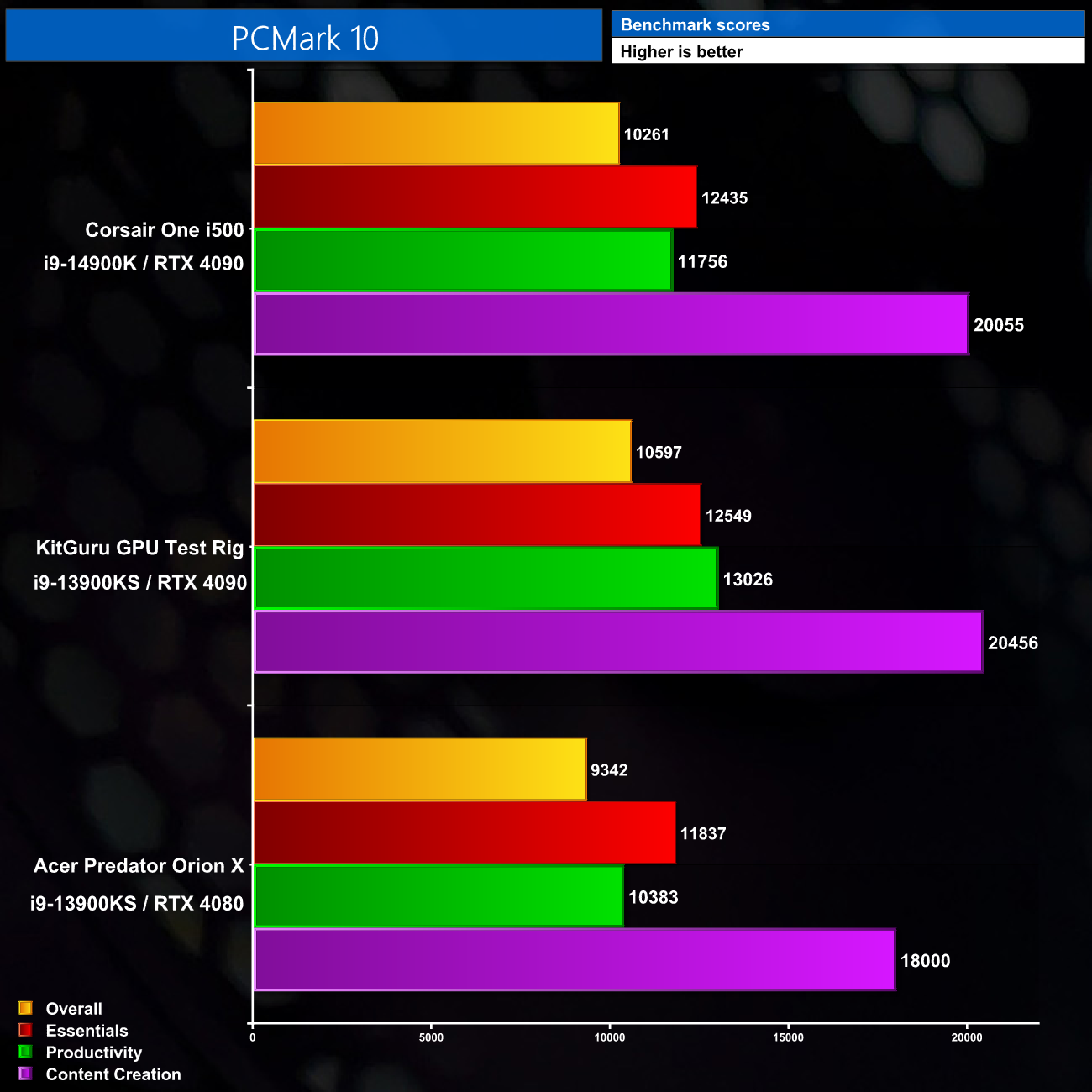 PCMark 10 is much of a muchness, there's not a whole lot of difference between the systems – the higher clocks do help our own test rig to slightly higher scores, especially in the Productivity workload.
