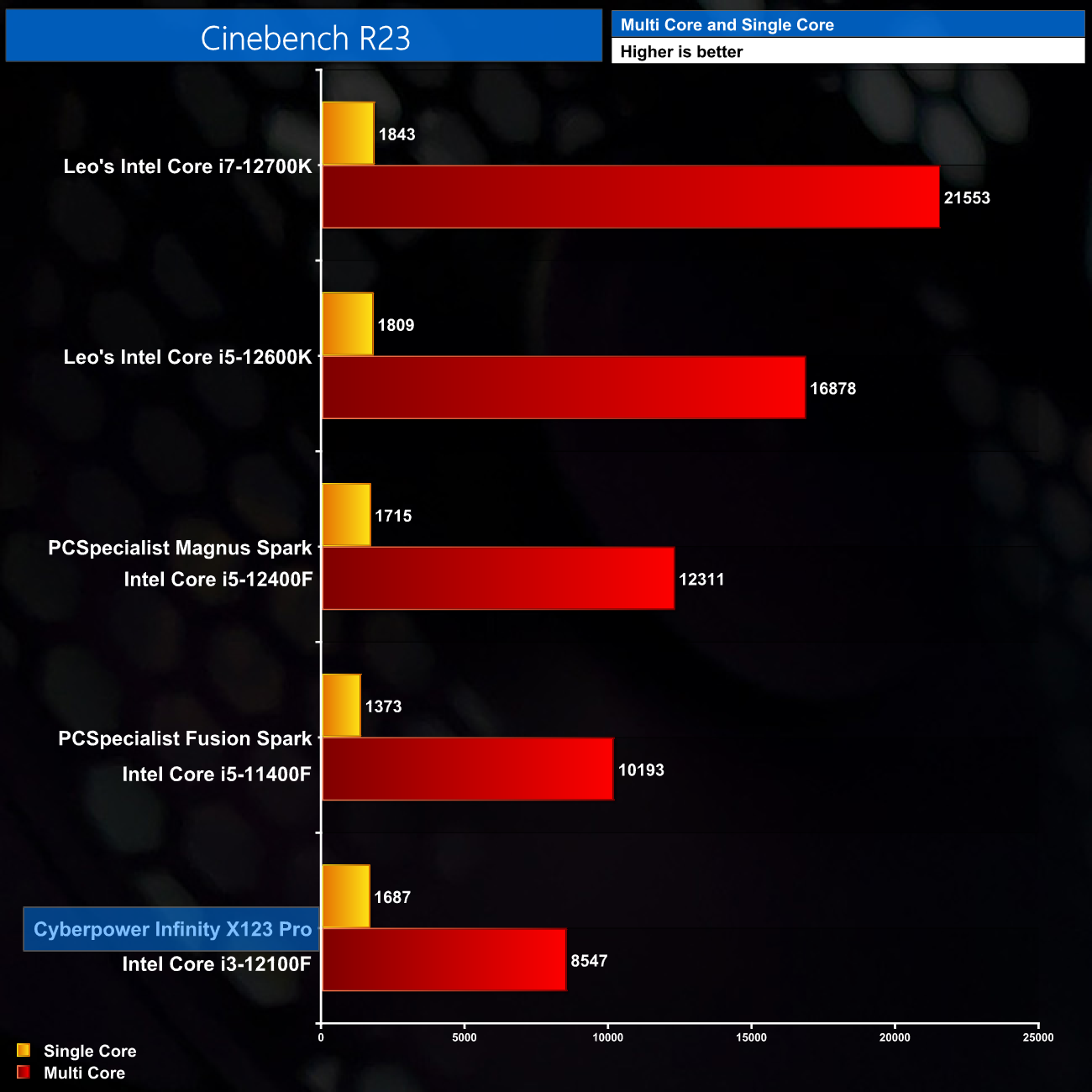 Relatively speaking, the i3-12100F does even better in Cinebench R23, where it is only 16% slower than the 11400F in the multi-threaded test, which is really pretty impressive considering the i5 has two extra cores. The single-core result is only marginally behind the i5-12400F as well, while it is miles clear of the 11400F thanks to the newer Alder Lake architecture.