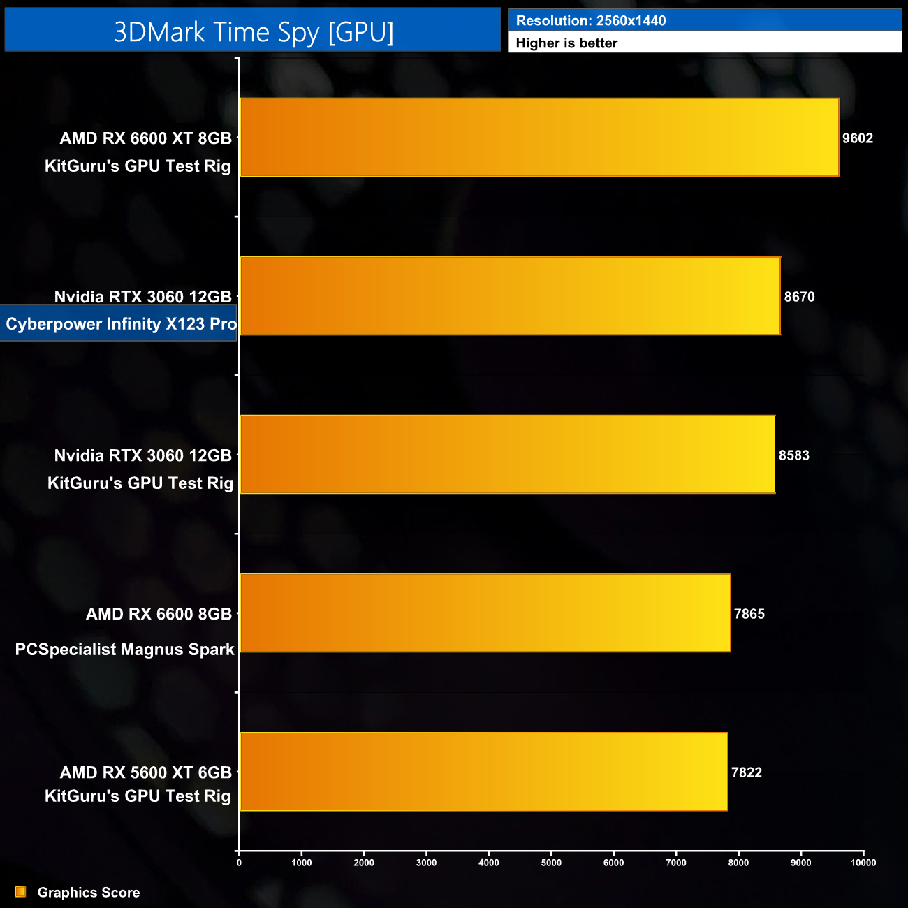 As for the GPU score in 3DMark Time Spy, the MSI Ventus 2X RTX 3060 proved exactly as fast as we’d expect, closely matching the RTX 3060 that I use in my GPU reviews, and easily outscoring the RX 6600, so that bodes well for our game benchmarks.