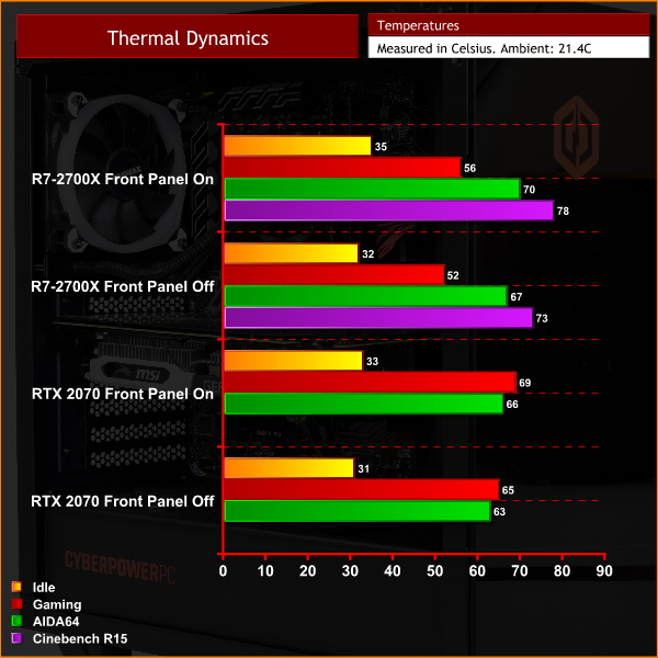 It's not like the figures are terrible with the front panel on anyway – our CPU hit 56C when gaming, with the GPU running no hotter than 69C. I am sure a full mesh front panel would help, but based on our testing the component temperatures aren't terrible as is.