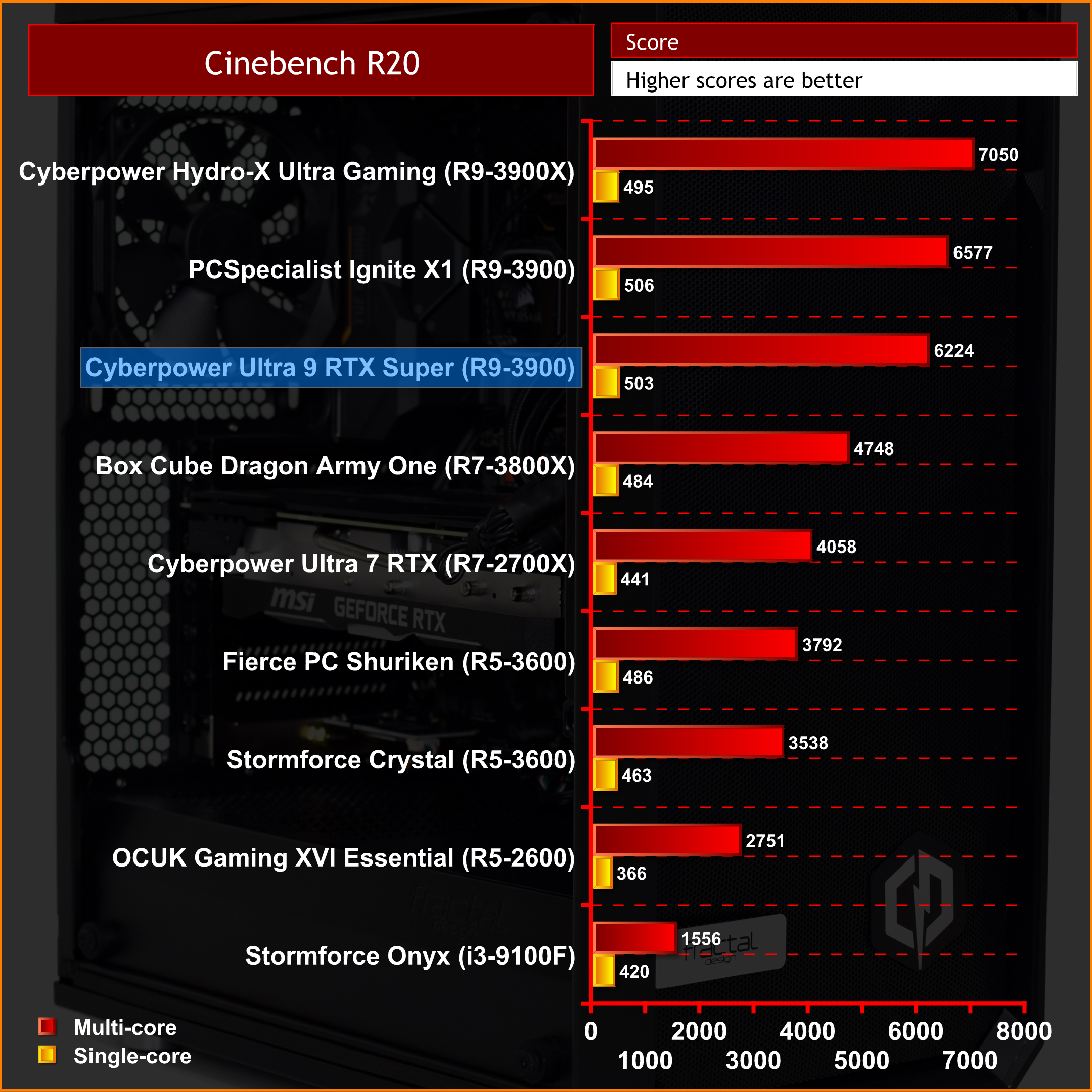 In terms of Cinebench scores, we can also observe a small difference between the two systems, with the Cyberpower producing multi-core scores which are 4 and 5% slower than the PCSpecialist system, for Cinebench R15 and R20, respectively. This isn't a huge difference by any means, but it is something.
