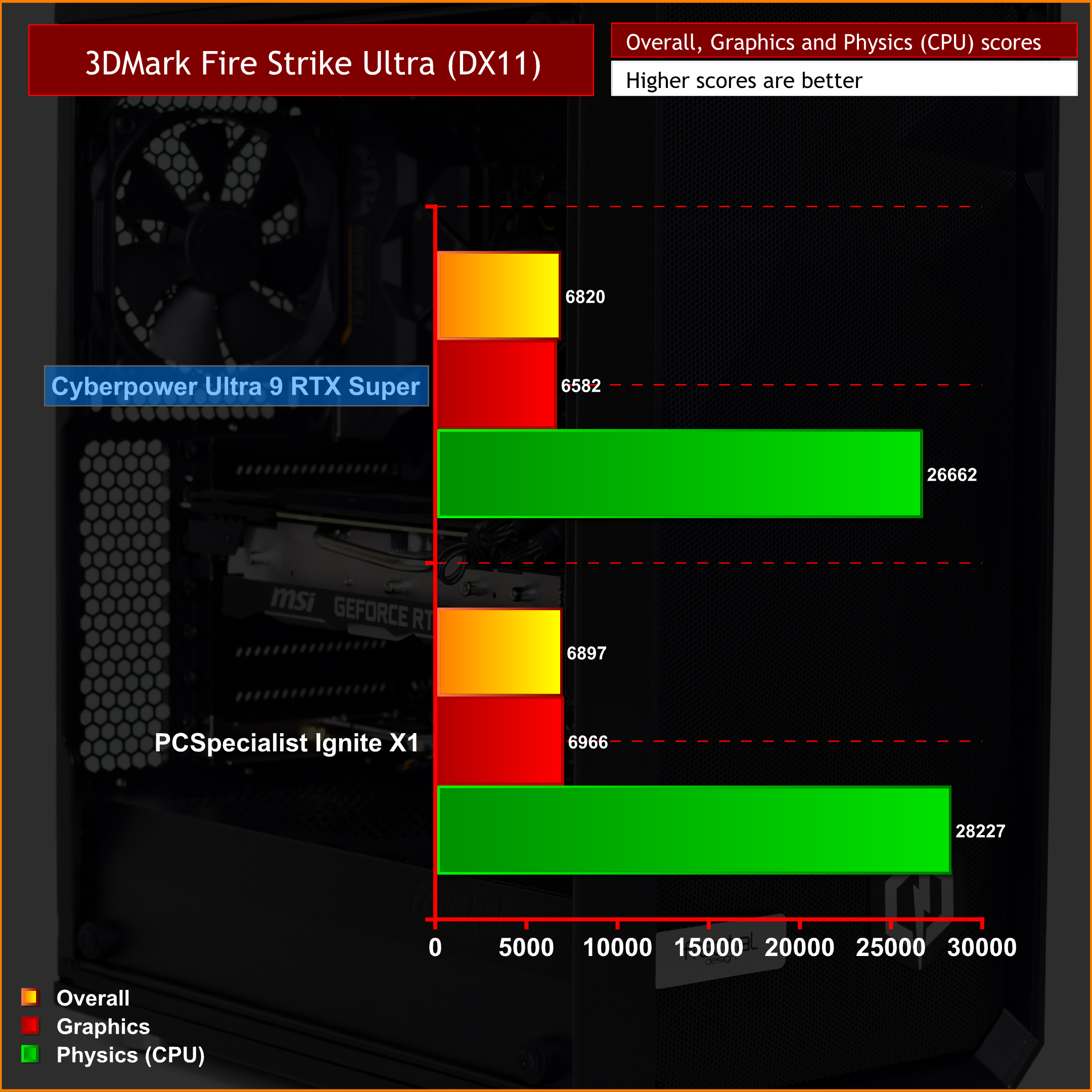 Diving into our 3DMark scores, here we have compared the Ultra 9 RTX Super with the PCSpecialist Ignite X1 which uses the same Ryzen 9 3900 CPU, but with an AMD RX 5700 XT graphics card. Despite this, the Fire Strike and Fire Strike Ultra tests do seem to favour AMD hardware in the graphics department, as the scores are marginally higher for the PCSpecialist system. However, there is much more of a noticeable difference in Time Spy, where the Cyberpower's overall score is 15% higher than the PCSpecialist.