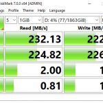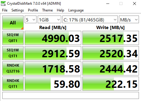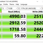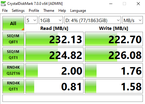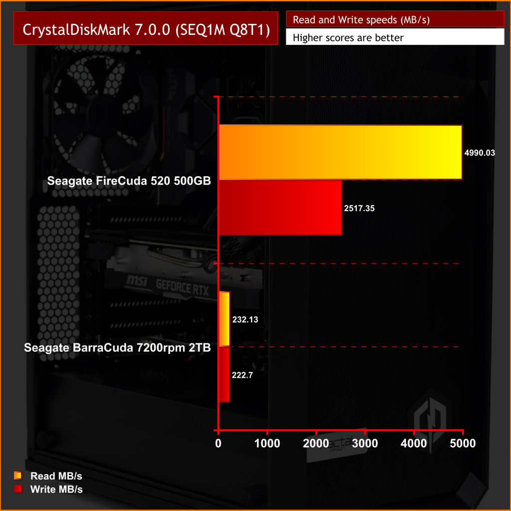 CrystalDiskMark also shows no problems, with the FireCuda 520 hitting its advertised speeds without a hitch. Similarly, the 2TB 7200RPM HDD is also running about as fast as we would expect from a mechanical drive.