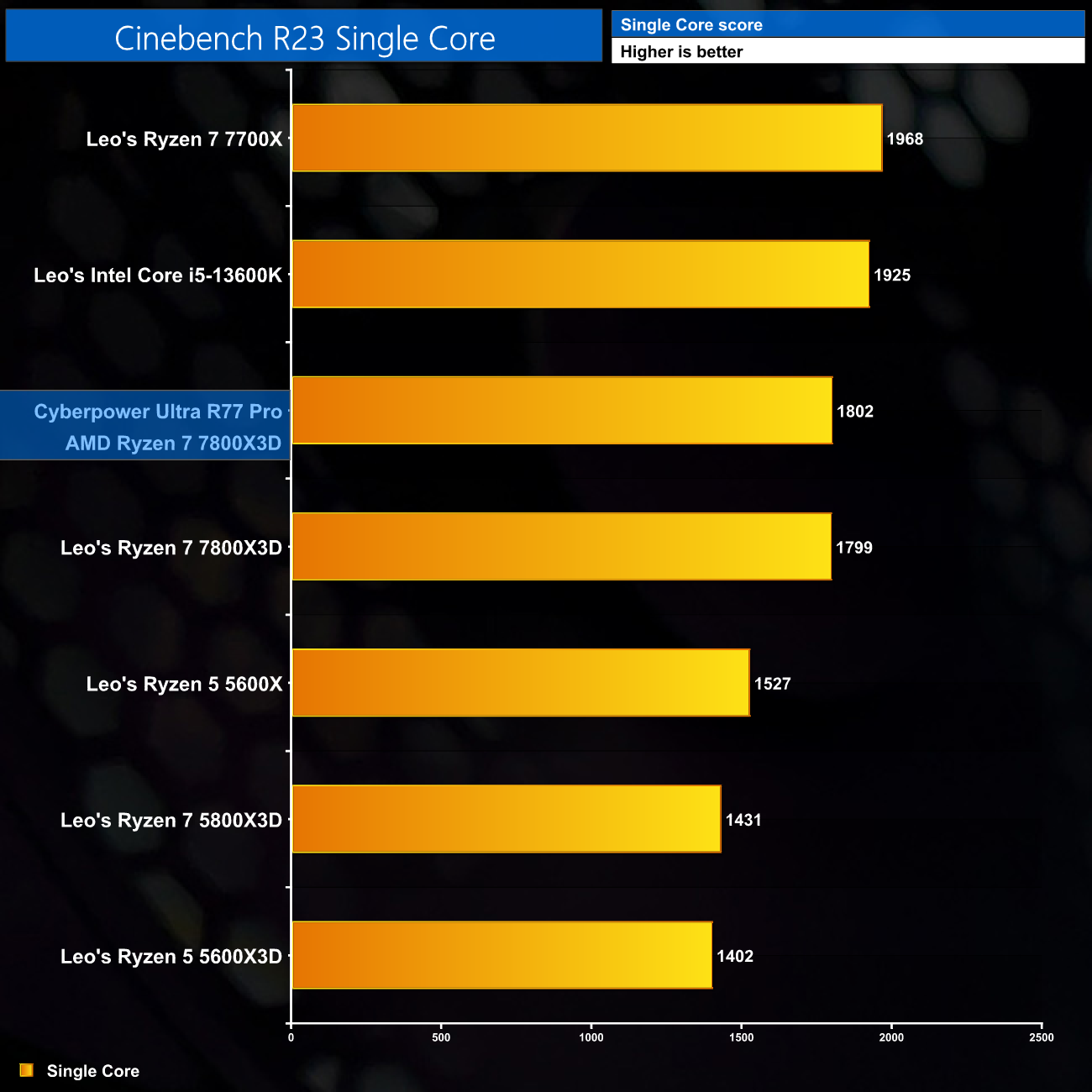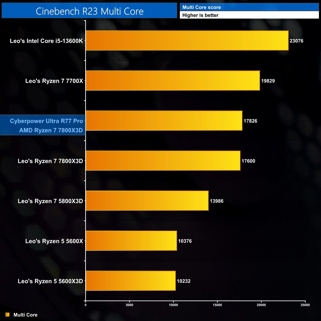 Starting our benchmarks with Cinebench R23, the 7800X3D in the Ultra R77 Pro is marginally outperforming the 7800X3D that Leo tested for his review. Its score of just below 17900 points does make it a touch slower than the 7700X due to the lower clock speed, but you can see the generational leap compared to the 5800X3D.