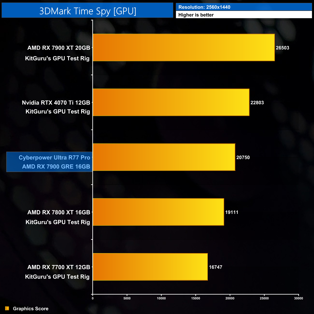 As for GPU performance, in 3DMark Time Spy we can see that the 7900 GRE slots between the 7800 XT and 7900 XT, though it is much closer to the former than it is to the latter. It's also about 2000 points behind the RTX 4070 Ti.