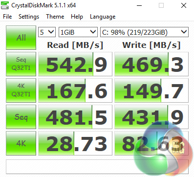 The SSD is fast, though it does not quite reach the maximum SATA 3 speeds we have seen other SSDs achieve. Something like a Samsung 850 EVO would have given it that extra edge, although in the real world you are unlikely to notice the difference.
