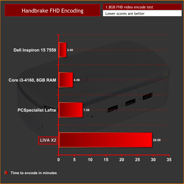 Moving on then to my Handbrake test, where I ask the CPU to encode a 1.8GB full-HD video file to the iPhone preset.