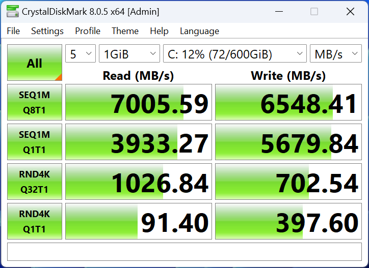 I also ran CrystalDiskMark on the SSD, with speeds as expected for a Gen4 drive, topping out at 7GB/s read and 6.5GB/s write.